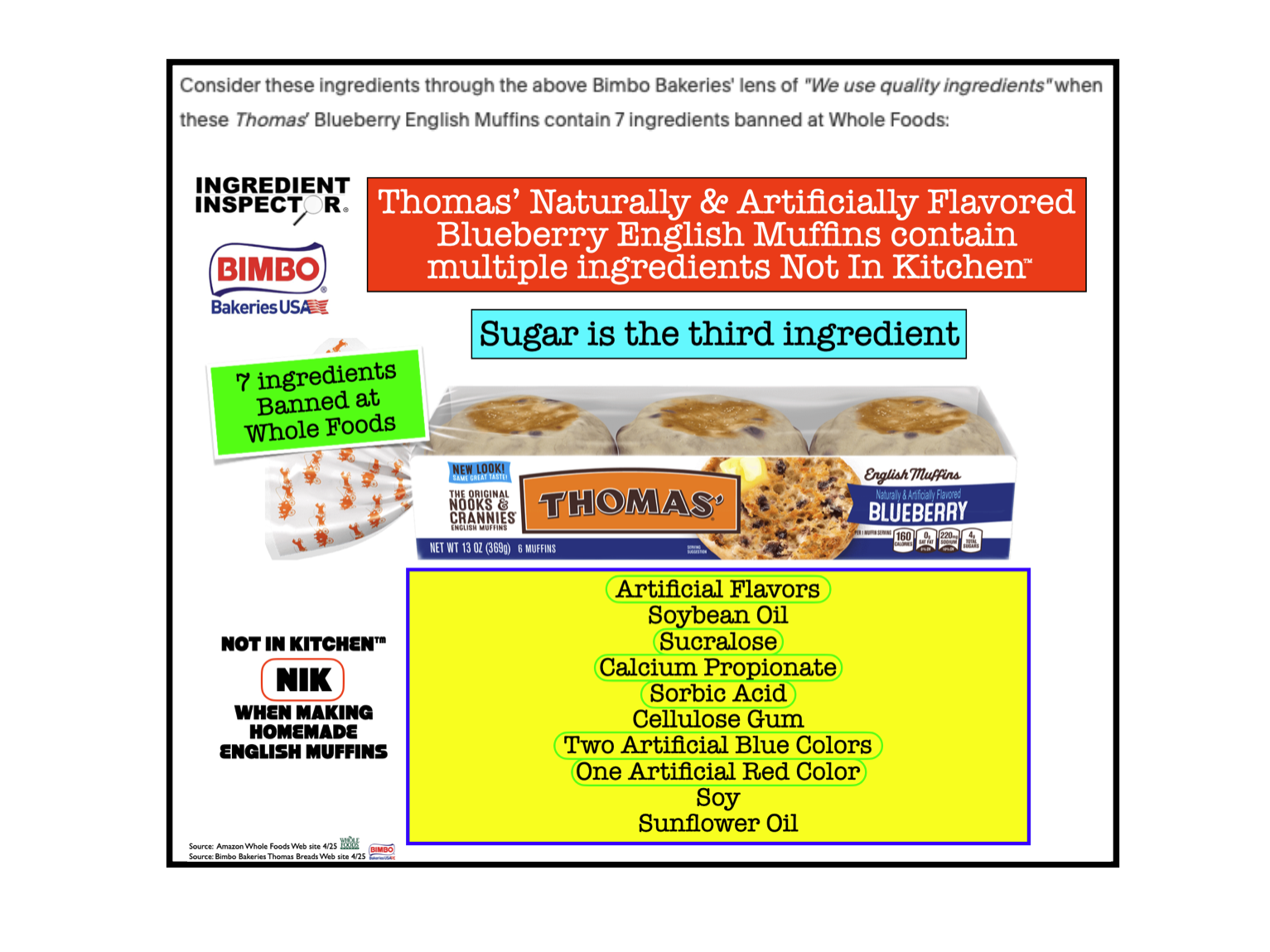 Here is the April 2025 Ingredient Inspector review of Thomas’ Blueberry English Muffins noting the multiple ingredients banned at Whole Foods: