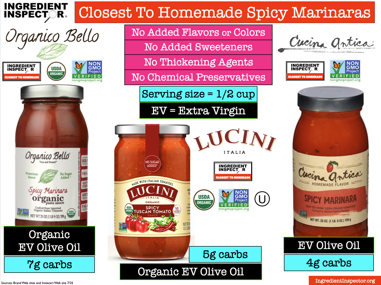 Seen below, Organic and Non-GMO Project verified Organico Bello Spicy Marinara made with Organic Extra Virgin Olive Oil; Organic and Non-GMO Project verified Lucini Spicy Tuscan Tomato Sauce made in Italy which is also certified Kosher made with Organic Extra Virgin Olive Oil, and Non-GMO Project verified Cucina Antica Spicy Marinara made with Extra Virgin Olive Oil and Italian Tomatoes.
