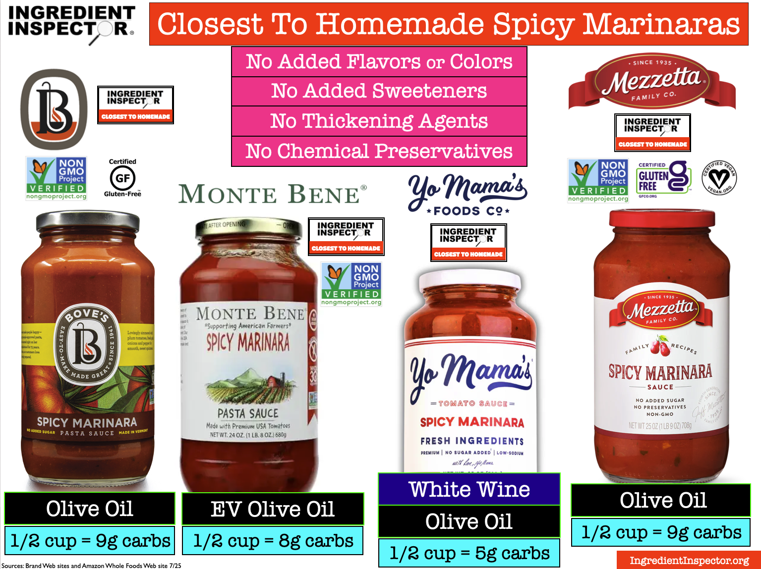 CLOSEST TO HOMEMADE SPICY MARINARAS: Bove’s of Vermont Spicy Marinara with Olive Oil is Non-GMO Project verified and certified Gluten-Free; Non-GMO Project verified Monte Bene Spicy Marinara with Extra Virgin Olive Oil; Yo Mama’s Spicy Marinara with Olive Oil and White Wine, and Mezzetta Spicy Marinara with Tomatoes from Italy’s San Marzano region with Olive Oil which is Non-GMO Project verified, certified Gluten-Free and Vegan.