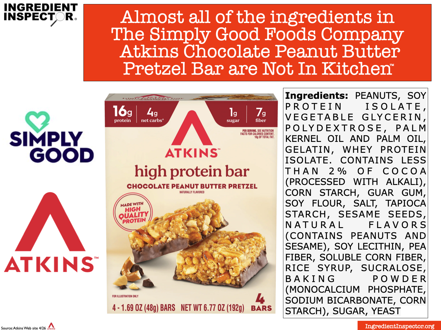 Q: WHAT IS THE SIMPLY GOOD FOOD COMPANY’S IDEA OF EATING RIGHT? Let’s look at what’s in some of the Atkins Meal Bars. (Source: The Simply Good Food Company Atkins Web site 4/26)