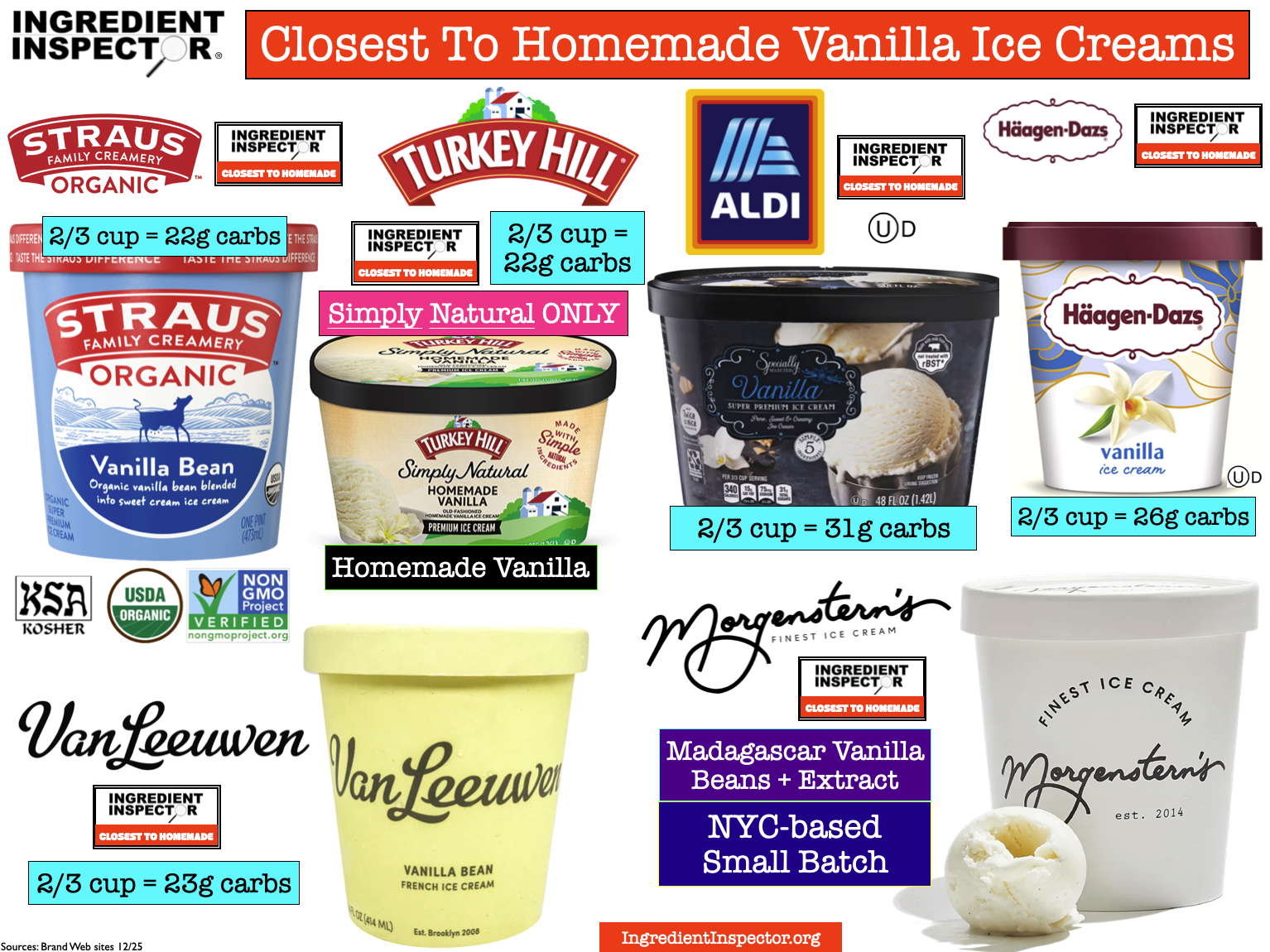 CLOSEST TO HOMEMADE VANILLA ICE CREAMS: Here are some Vanilla ice creams which are Closest To Homemade with real Vanilla Extract on the ingredient list and no ingredients Not In Kitchen when making homemade Vanilla ice cream. Yes, it can be done, yay! (Sources: Brand Web sites 12/25)