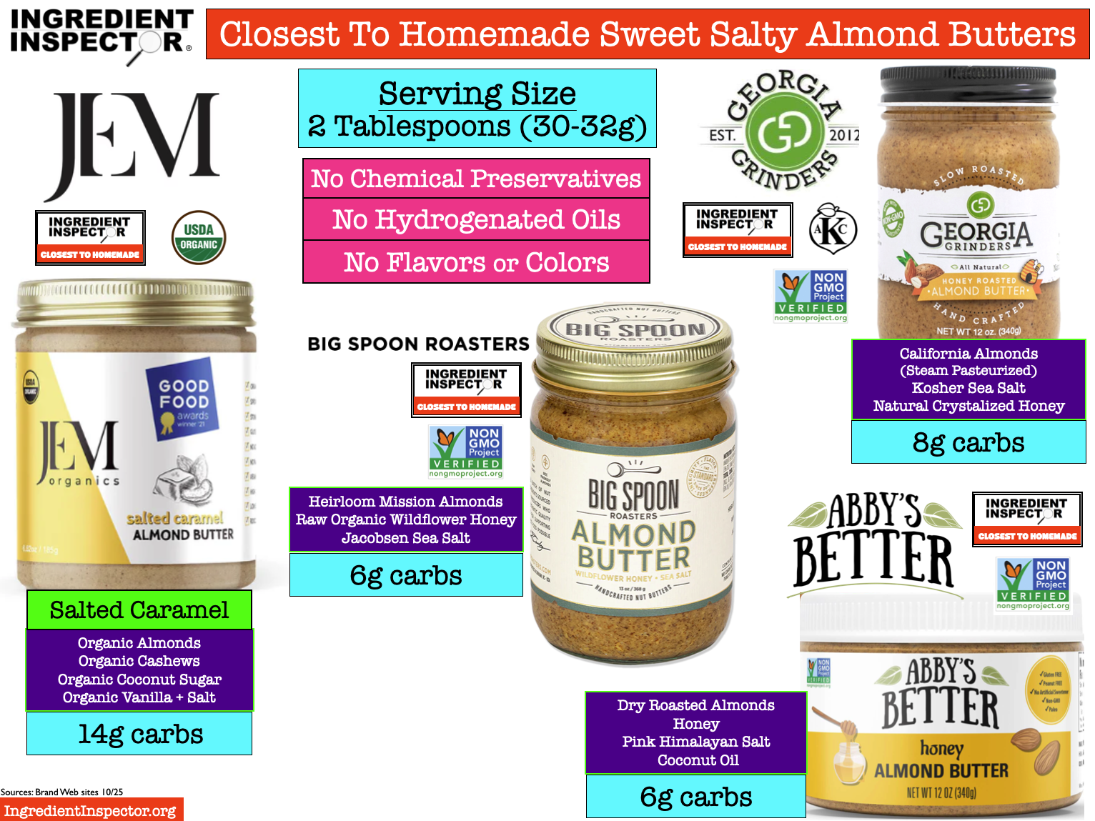 CLOSEST TO HOMEMADE ALMOND BUTTERS: The great news is there are numerous Almond Butters which are Closest To Homemade with only Almonds. These Almond Butters contain no Added Sweeteners, no Chemical Preservatives, no Hydrogenated Oils or Added Oils, no Flavors or Colors and no Salt. (Sources: Brand Web sites 10/25)