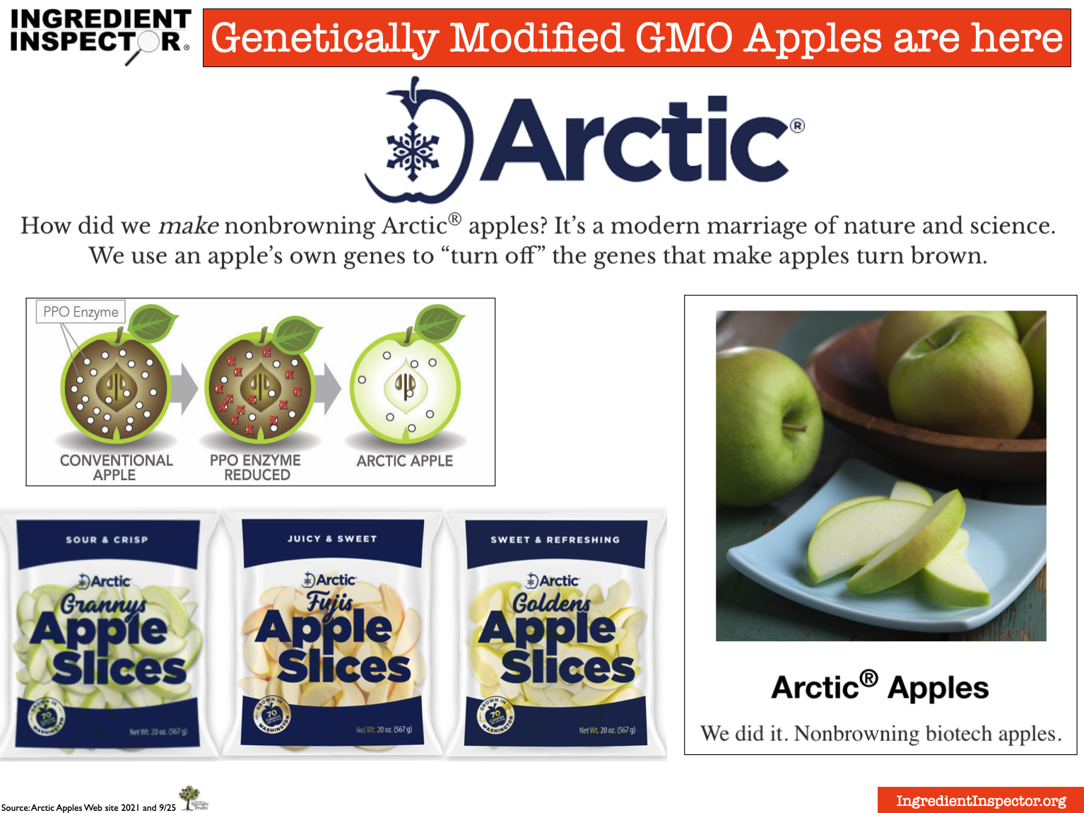 A NOTE ON GENETICALLY MODIFIED APPLES: GMO apples have entered the U.S. market >> the brand Arctic Apples has “turned off the genes that make apples turn brown.” This technology enables them to deliver peeled + sliced + bagged GMO apples. (Source: Arctic Apples Web site 9/25) Please carefully consider consumption of these apples and all GMO items as they are harmful on multiple environmental and physical levels. There’s a reason why apples from Mother Nature turn brown when they are cut open and this is a scientific process of “turning off the genes that make apples turn brown” so they can deliver the benefit of sliced apples in a bag.