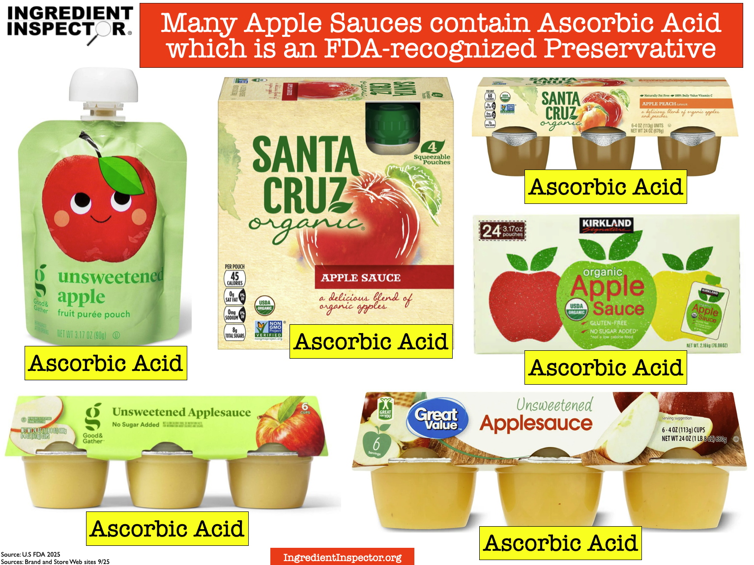 These brands have nothing Not In Kitchen >> they contain only things that would be in our kitchens if we were making Apple Sauce at home. They have no added Sweeteners, Flavors, Colors, Water or Chemical Preservatives. Hurray! (Sources: Brand Web sites 9/25)