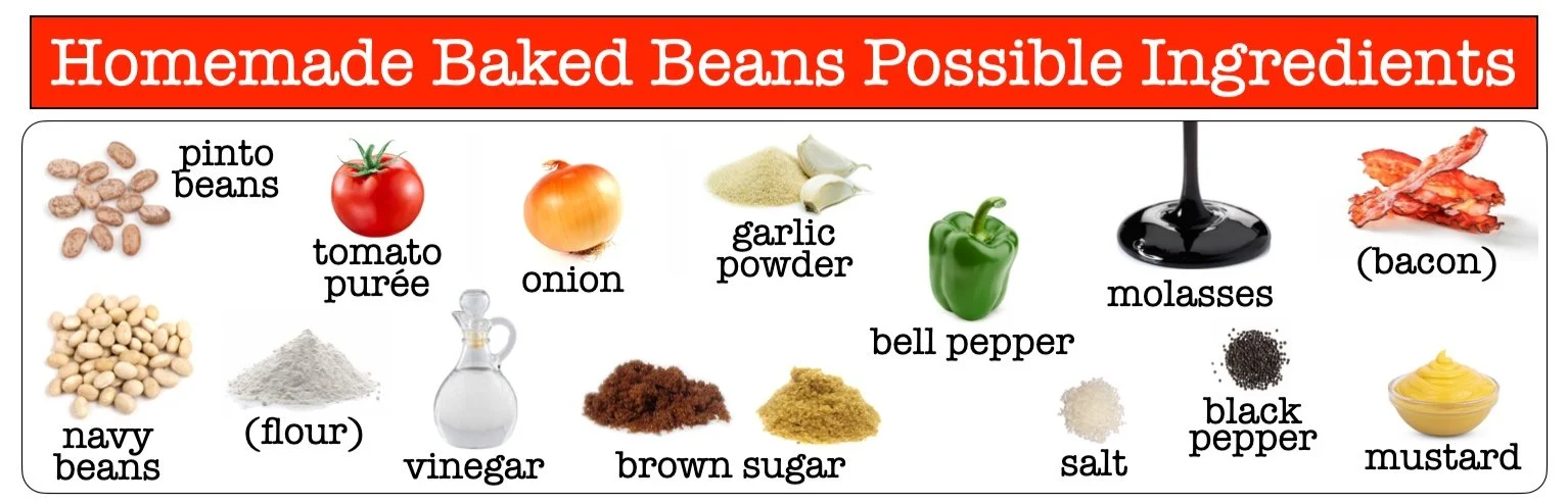 Possible ingredients for homemade Baked Beans include Beans, Tomato Purée, Bell Pepper, Onion, Brown Sugar, Molasses, Vinegar, Water, Salt, Spices and possibly Bacon and/or Flour. We’ll use this as a means to compare the ingredients we find in the canned Baked Beans in this review.