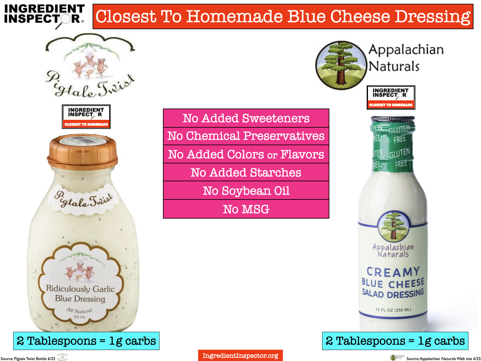 The good news is we found two Blue Cheese Dressings whose ingredients are closest to those we would use at home from Pigtale Twist and Appalachian Naturals.