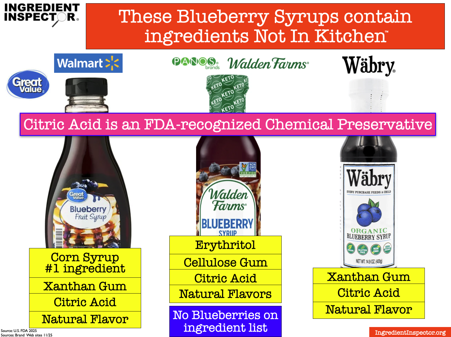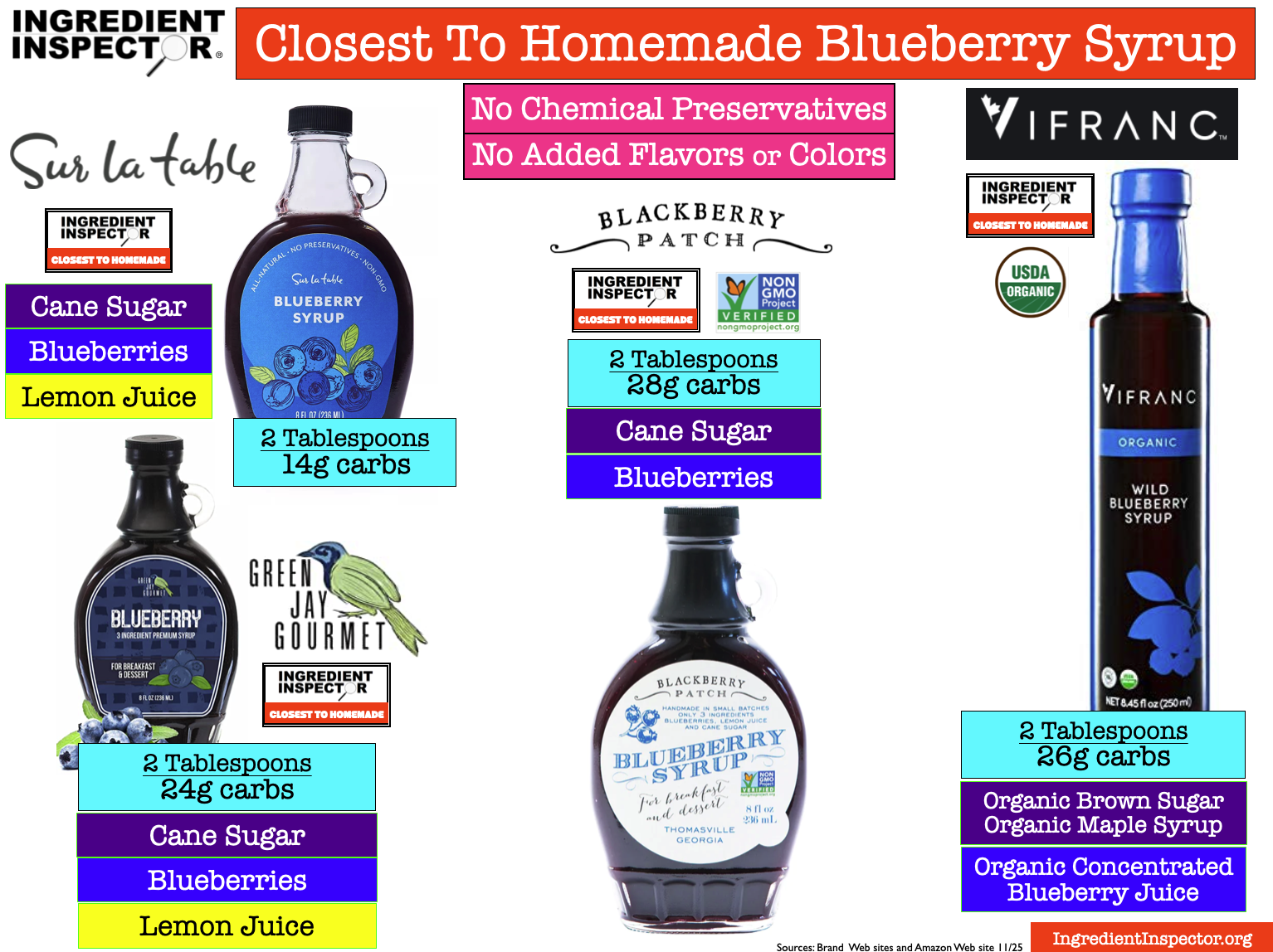 BLUEBERRY SYRUPS: These Blueberry Syrups below contain no added Chemical Preservatives, Flavors or Colors. Their basic ingredients are Blueberries, Added Sweetener(s)) and Water. These include Sur la Table, Green Jay Gourmet, Non-GMO Project verified Blackberry Patch and Organic Vifranc.