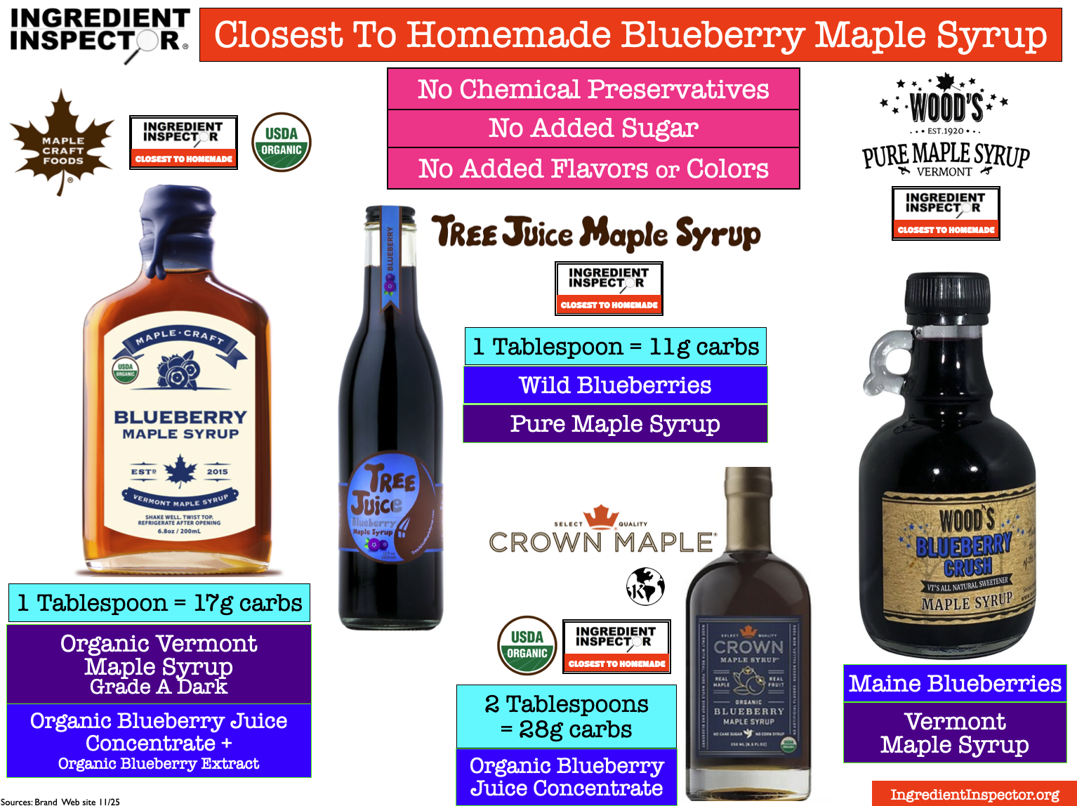 BLUEBERRY MAPLE SYRUPS: The first group is Blueberry Maple Syrups with no Chemical Preservatives, added Sugar, Flavors or Colors. These include Organic Maple Craft Foods, Tree Juice Maple Syrup, Organic Crown Maple and Wood’s Blueberry Crush.