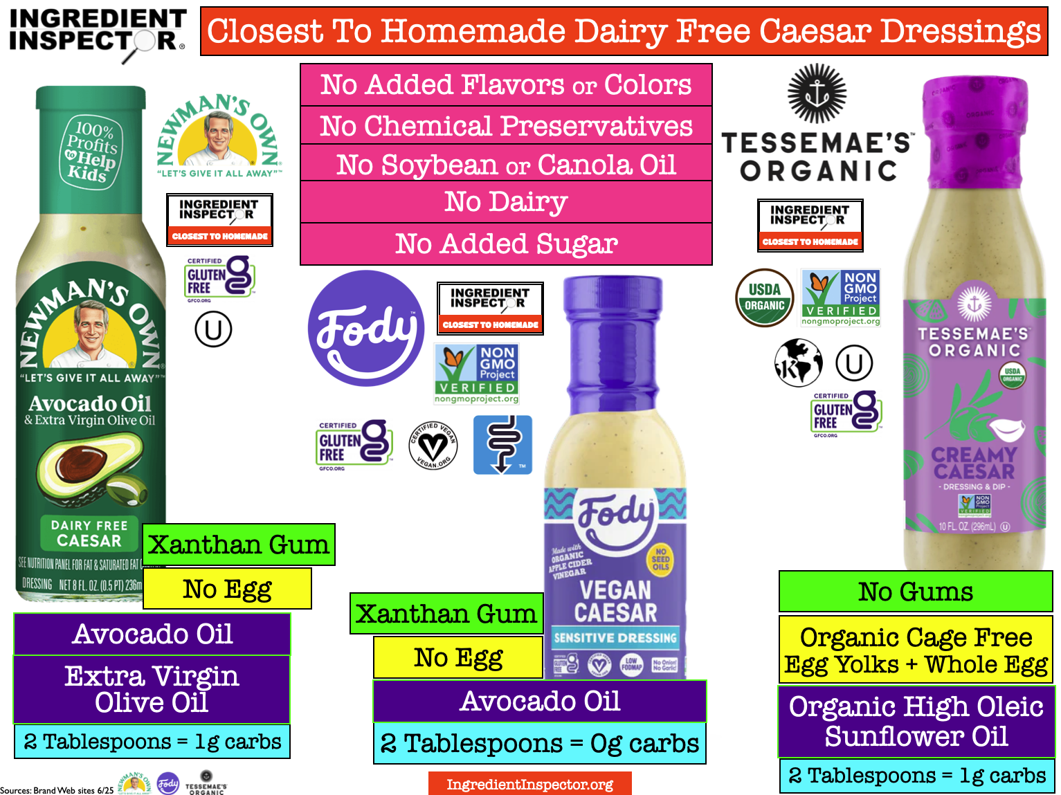 CLOSEST TO HOMEMADE DAIRY FREE CAESAR DRESSINGS: Following are some Closest To Homemade Caesar Dressings with no Added Flavors, Colors, Chemical Preservatives, Soybean Oil, Canola Oil, Dairy or added Sugar. These include Newman’s Own Dairy Free Caesar with Avocado Oil and Extra Virgin Olive Oil with no Egg: Fody Vegan Caesar with Avocado Oil and no Egg; and Tessemae’s Organic and certified Kosher and Gluten-Free Creamy Caesar made with Organic High Oleic Sunflower Oil and Organic Cage Free Egg Yolks + Whole Egg. (Sources for ingredients: Brand Web sites 6/25)