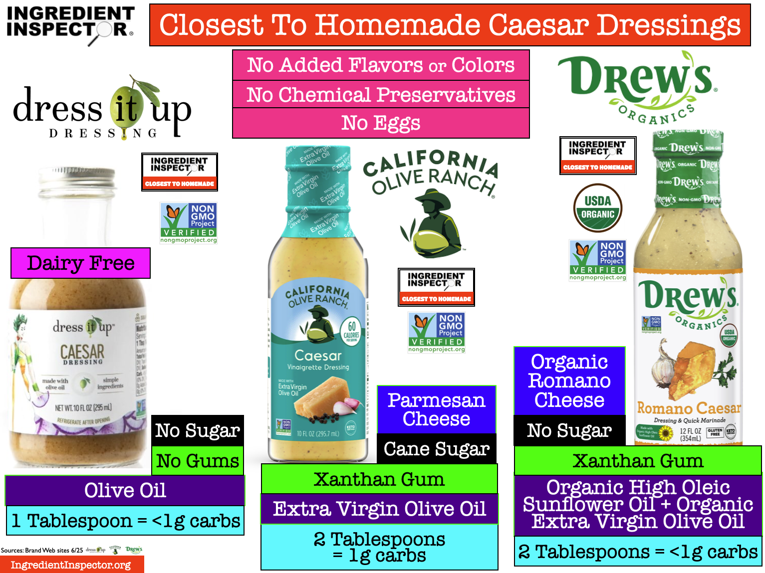 CLOSEST TO HOMEMADE CAESAR DRESSINGS: Following are some Closest To Homemade Caesar Dressings with no Added Flavors, Colors, Chemical Preservatives or Eggs. These include Non-GMO Project Verified Dress It Up Caesar Dairy Free Dressing with Olive Oil and Sugar; Non-GMO Project Verified California Olive Ranch Caesar Vinaigrette sweetened with Cane Sugar made with Extra Virgin Olive Oil and Parmesan Cheese, and Non-GMO Project Verified Drew’s Organics Romano Caesar with Organic High Oleic Sunflower Oil + Organic Extra Virgin Olive Oil and Organic Romano Cheese with no added Sugar. (Sources for ingredients: Brand Web sites 6/25)