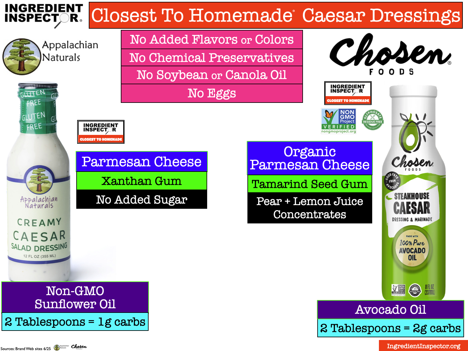 Following are a couple of other Closest To Homemade Caesar Dressings from Appalachian Naturals with Non-GMO Sunflower Oil and Parmesan Cheese with no Added Sugar or Egg, and Chosen Foods made with Avocado Oil and Organic Parmesan Cheese with no Egg and a small amount of Pear + Lemon Juice Concentrates. (Sources: Brand Web sites 6/25)