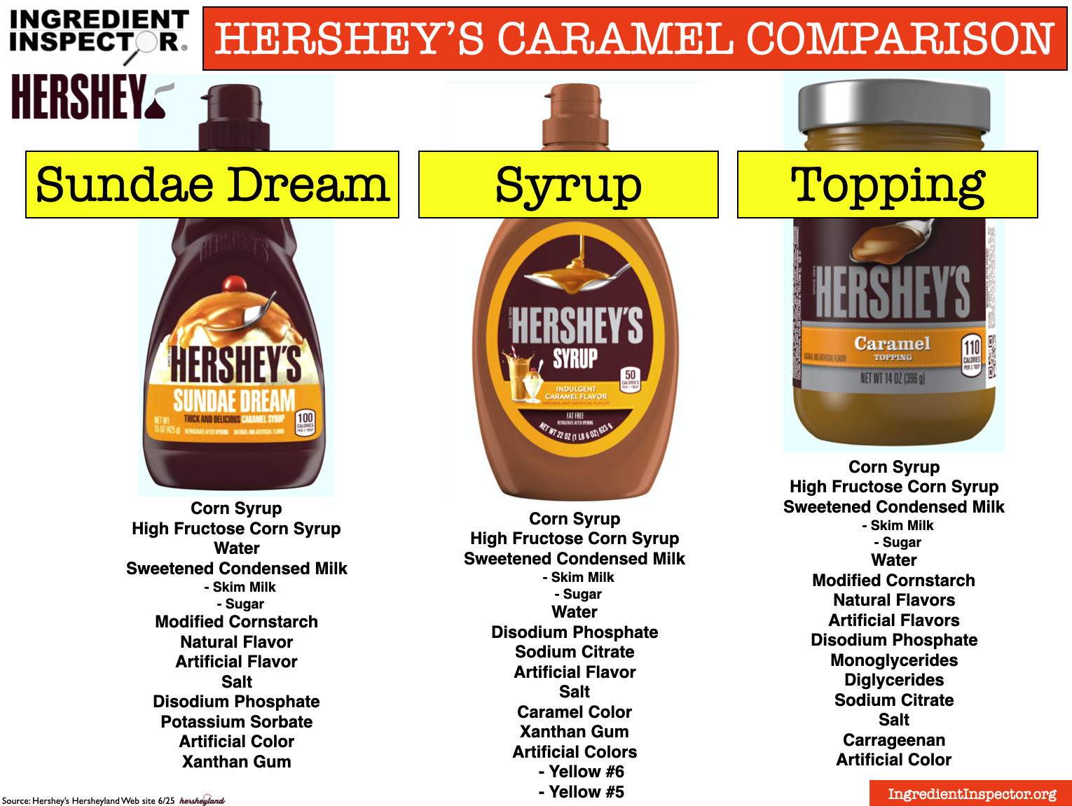 HERSHEY’S vs. FRAN’S: Below is a comparison of the ingredients in Hershey’s Caramel Flavored Syrup vs. Fran’s Caramel Sauce which is Closest To Homemade. (Sources: Hershey’s Hersheyland and Fran’s Web sites 6/25)
