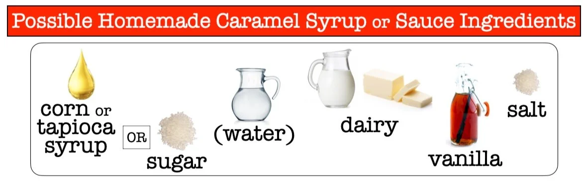 If we were making Caramel Syrup or Sauce in our home kitchens, the possible ingredients include Corn or Tapioca Syrup OR Sugar, Water, Dairy, Vanilla and Salt.