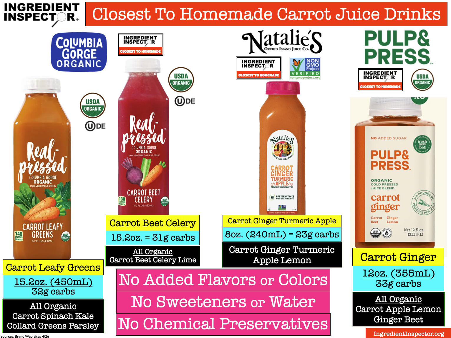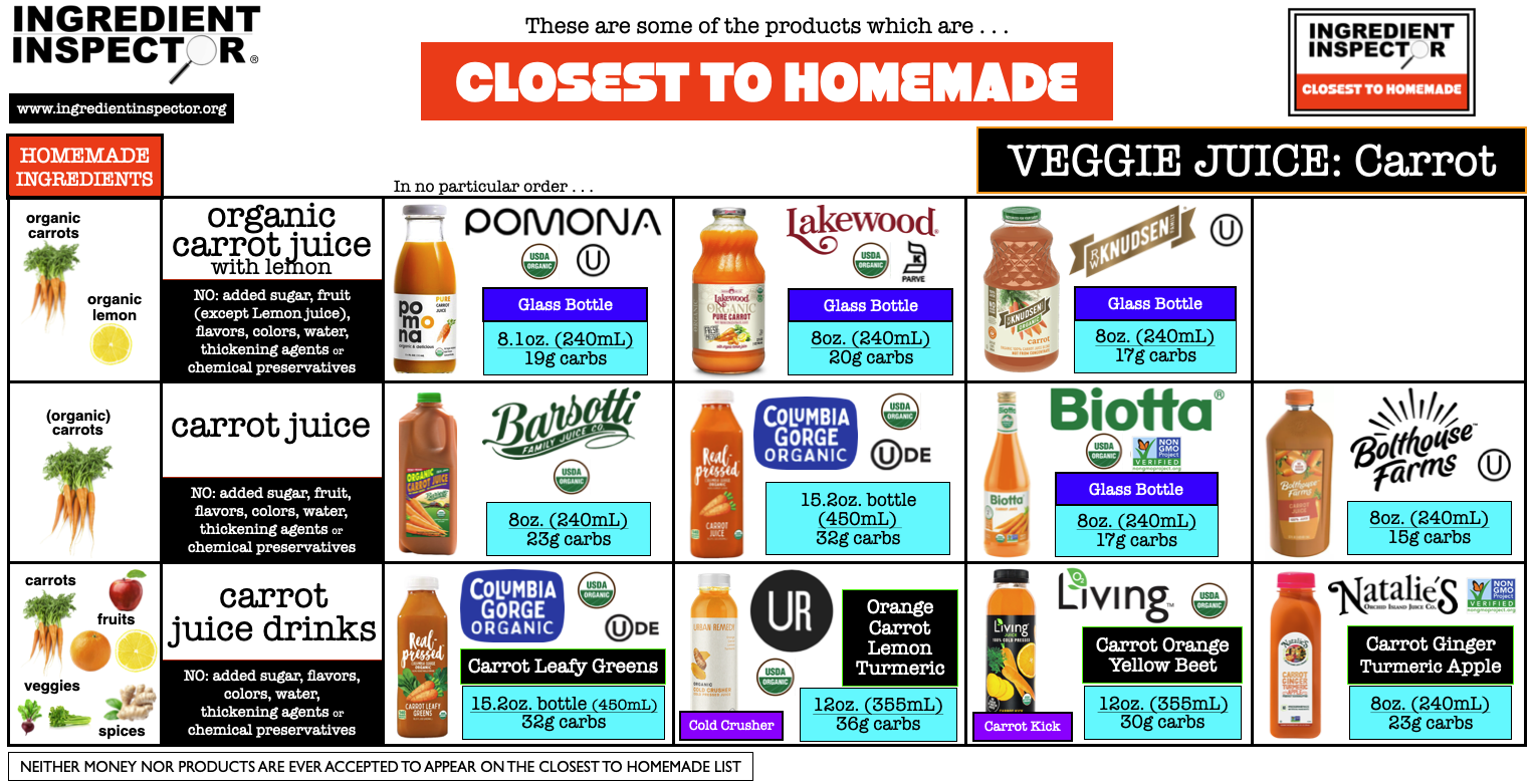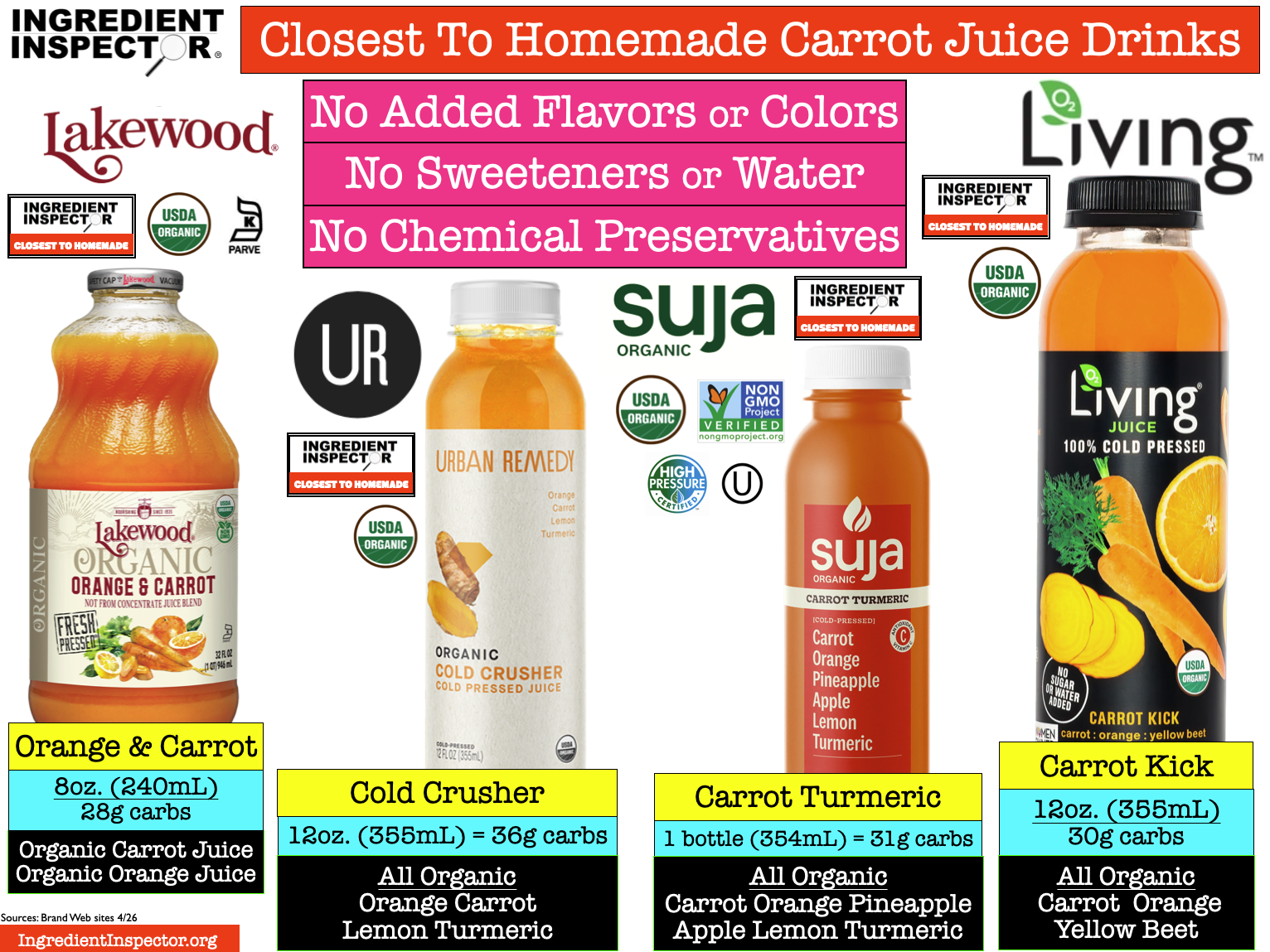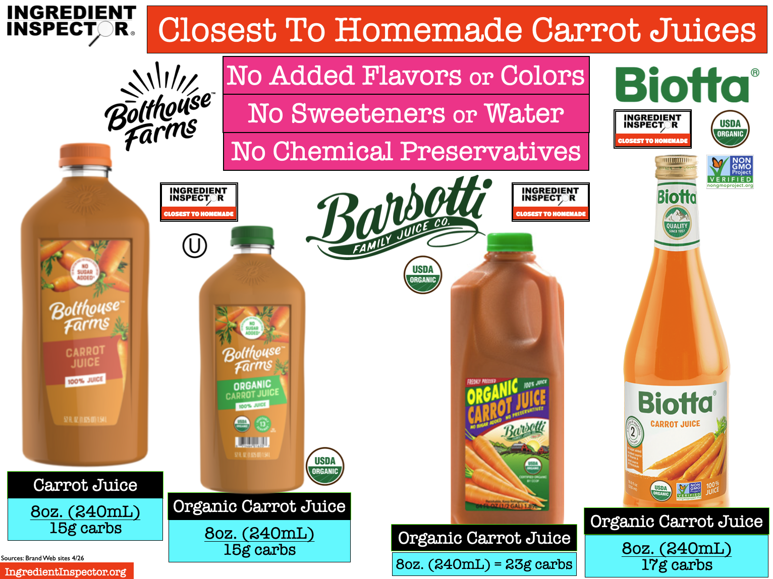 CARROT JUICES CLOSEST TO HOMEMADE: Following are several Carrot Juices which are Closest To Homemade with no added Flavors, Colors, Sweeteners, Water or Chemical Preservatives. These include Lakewood Organic, Pomona Organic Juices, R.W. Knudsen Organic, Columbia Gorge Organic, Bolthouse Farms and Bolthouse Farms Organic, Barsotti Family Juice Co. Organic, and Biotta Organic. (Sources: Brand Web sites 4/26)