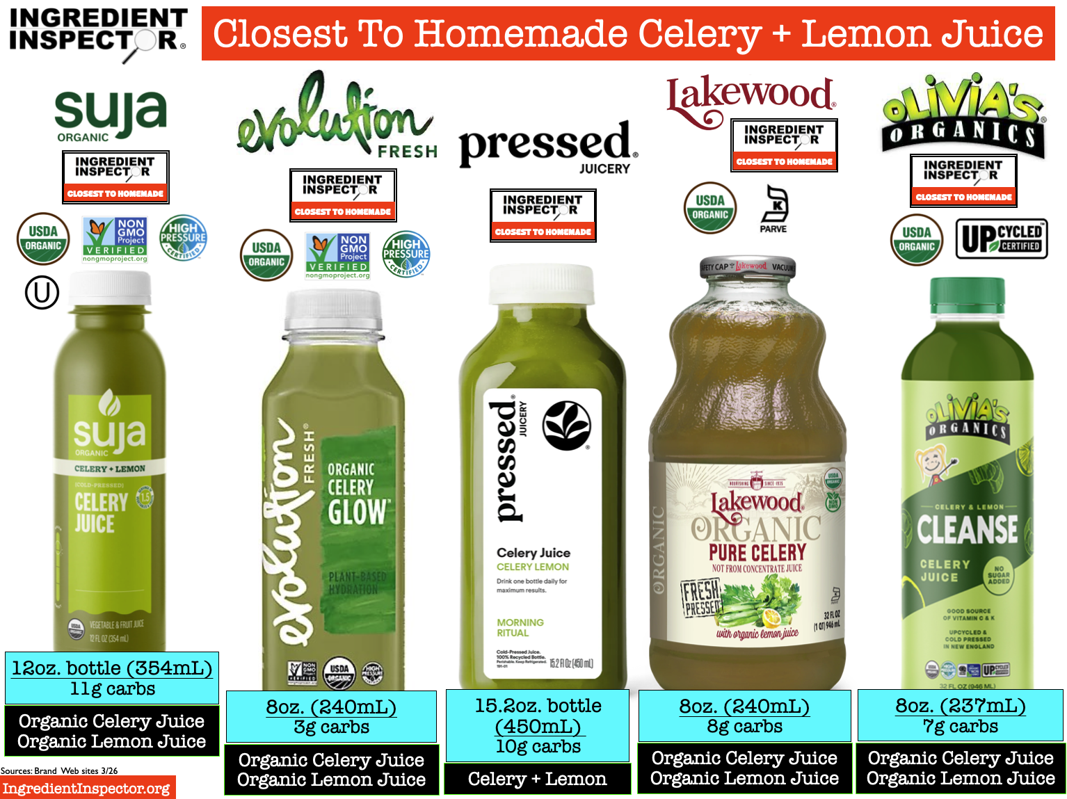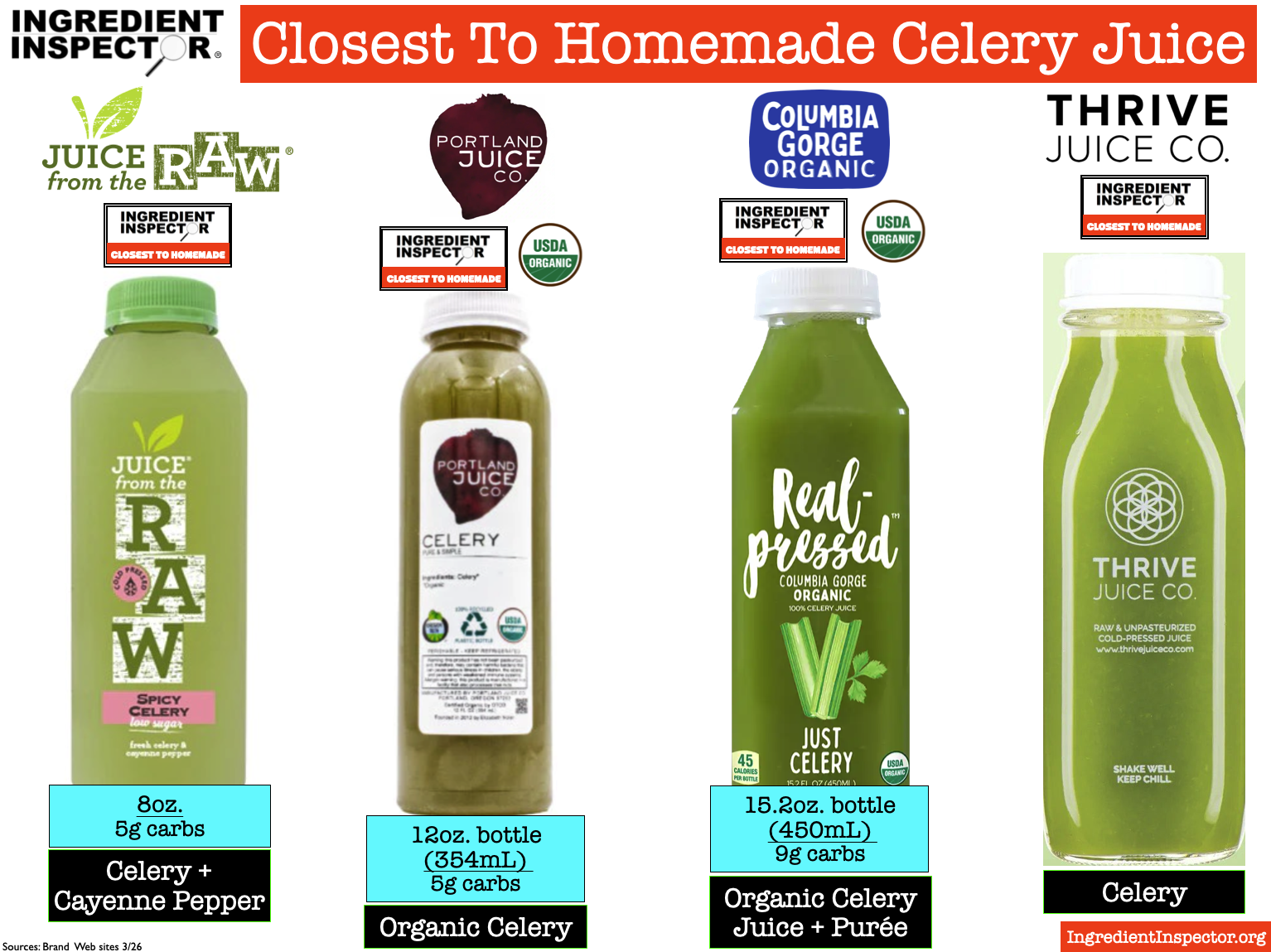 The Closest To Homemade Celery Juices which are simply Celery and possibly Lemon include Juice From The Raw, Portland Juice Co. Organic, Columbia Gorge Organic, Thrive Juice Co., Suja Organic, Evolution Fresh Organic, Pressed Juicery, Lakewood Organic and Olivia’s Organics. (Sources: Brand Web sites 3/26)