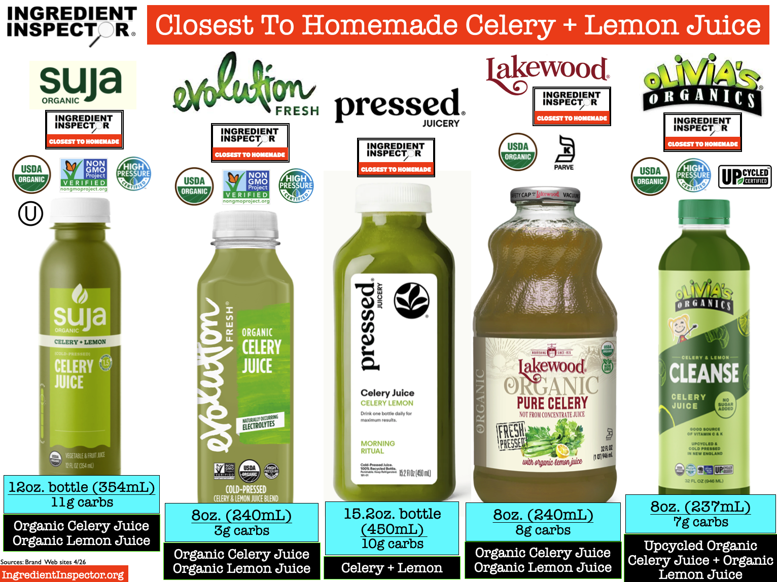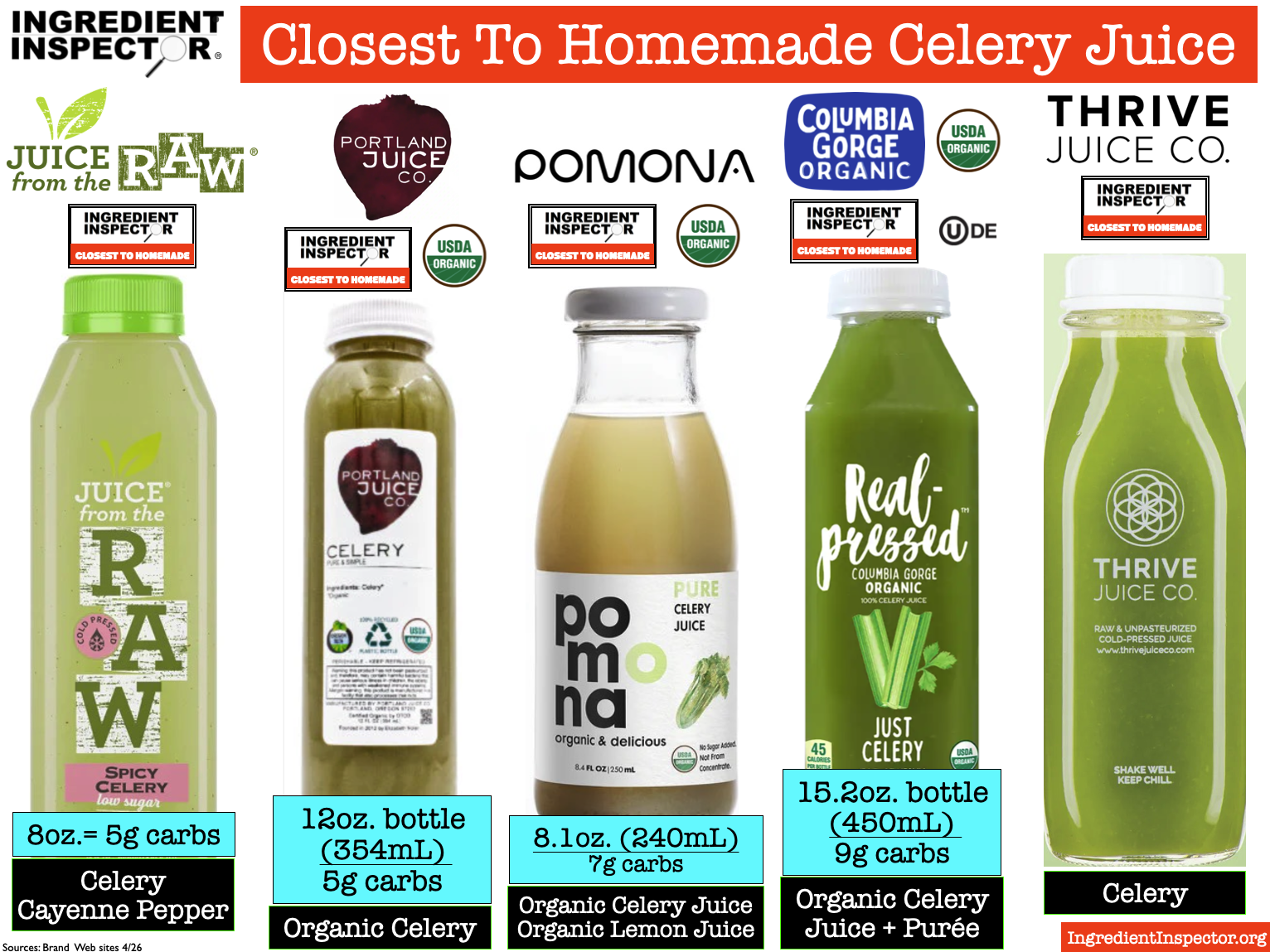 The Closest To Homemade Celery Juices which are simply Celery and possibly Lemon include Juice From The Raw, Portland Juice Co. Organic, Pomona Organic Juices, Columbia Gorge Organic, Thrive Juice Co., Suja Organic, Evolution Fresh Organic, Pressed Juicery, Lakewood Organic and Olivia’s Organics. (Sources: Brand Web sites 4/26)