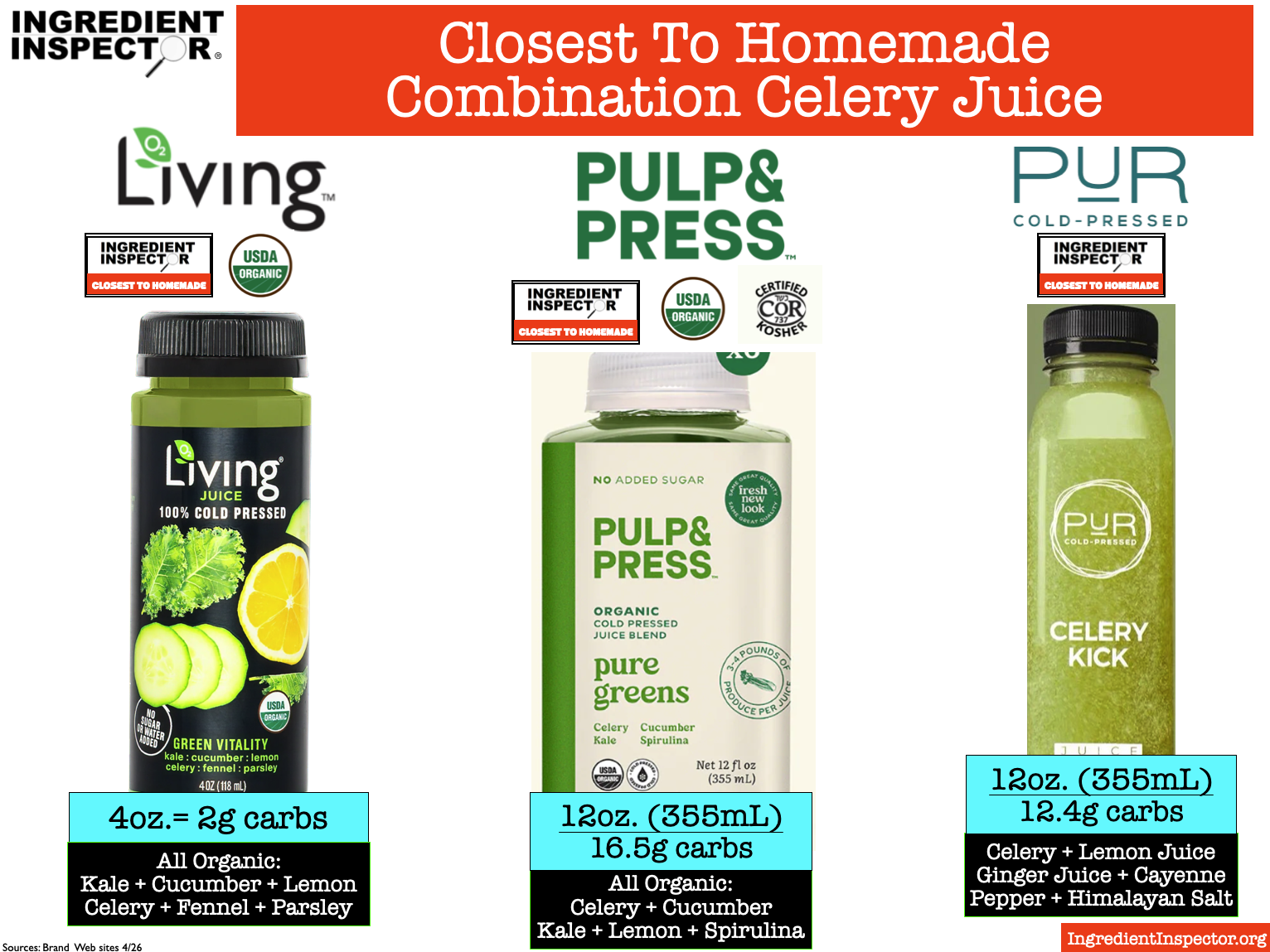 Seen below, the Closest To Homemade Combination Celery Juices include Green Vitality Organic from Living Juice, Organic Pulp & Press Pure Greens and PUR Celery Kick. (Sources: Brand Web sites 4/26)
