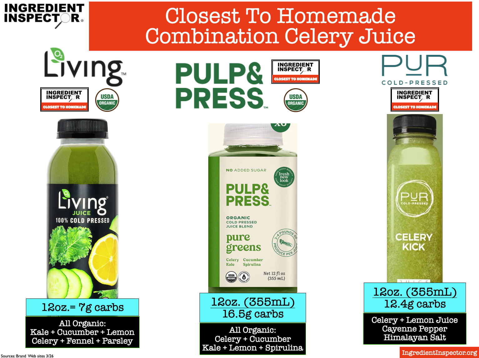 Seen below, the Closest To Homemade Combination Celery Juices include Green Vitality Organic from Living Juice, Organic Pulp & Press Pure Greens and PUR Celery Kick. (Sources: Brand Web sites 3/26)