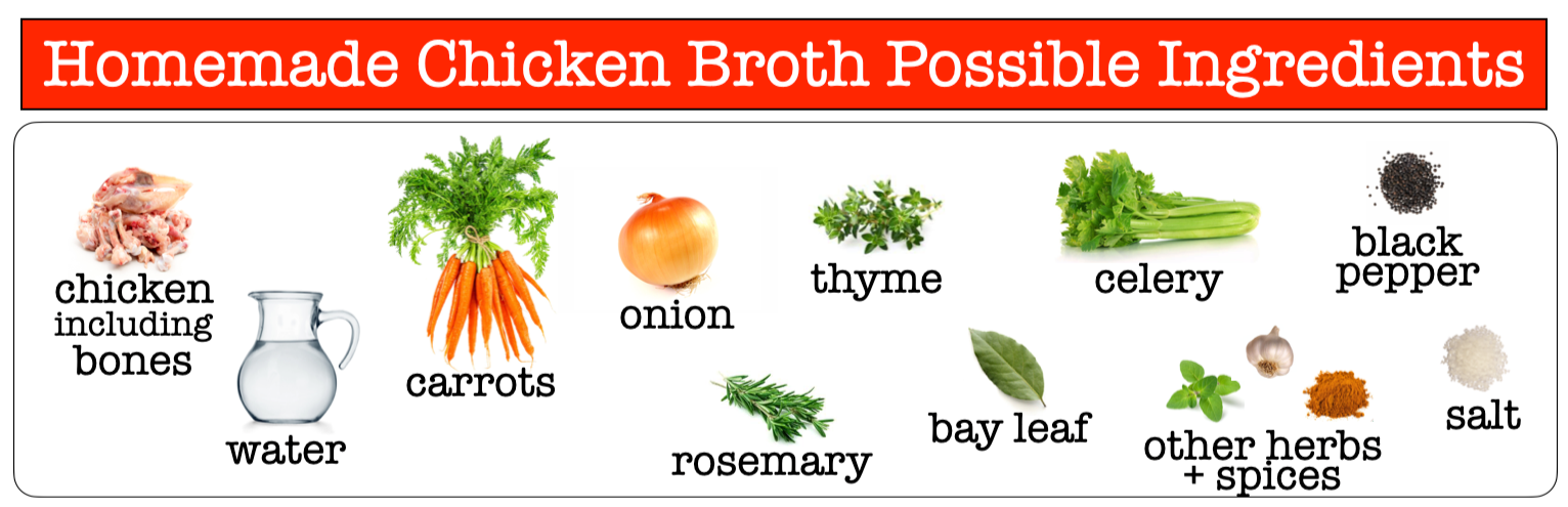 Homemade Chicken Broth is a labor of love made with the essential ingredients of Water and Chicken — including the bones. Beyond that, the seasoning varies and may include such items as Carrots, Onion, Rosemary, Thyme, Bay Leaf, Celery, Black Pepper, Salt and other Herbs + Spices.