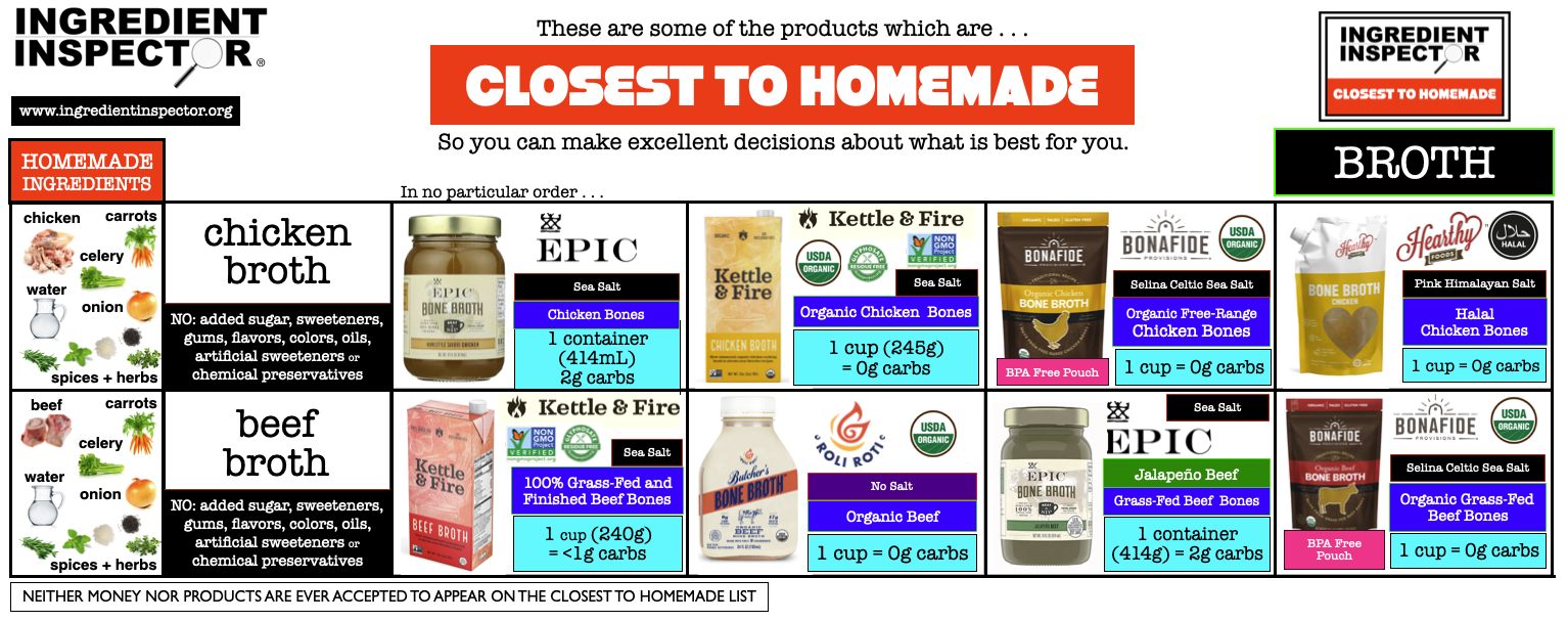 CLOSEST TO HOMEMADE CHICKEN BROTHS: Seen below are two slides of Closest To Homemade Chicken Broths with no added Chemical Preservatives, Sweeteners, Oils, Flavors, Colors or Gums.