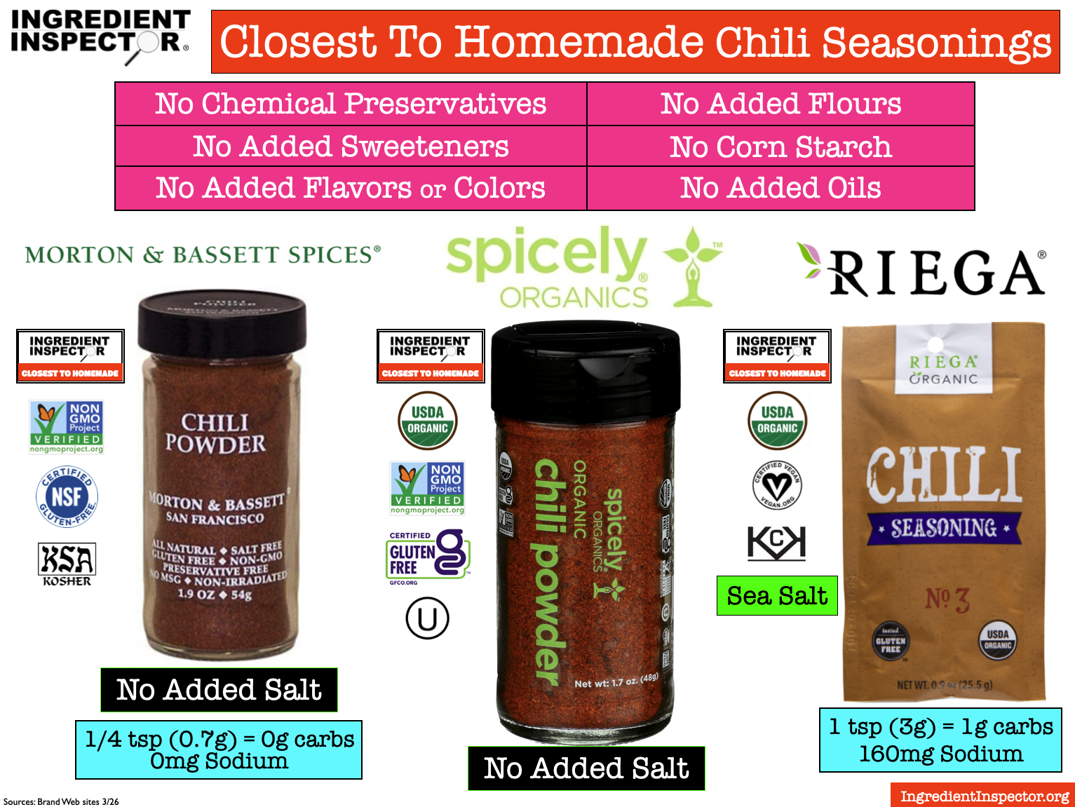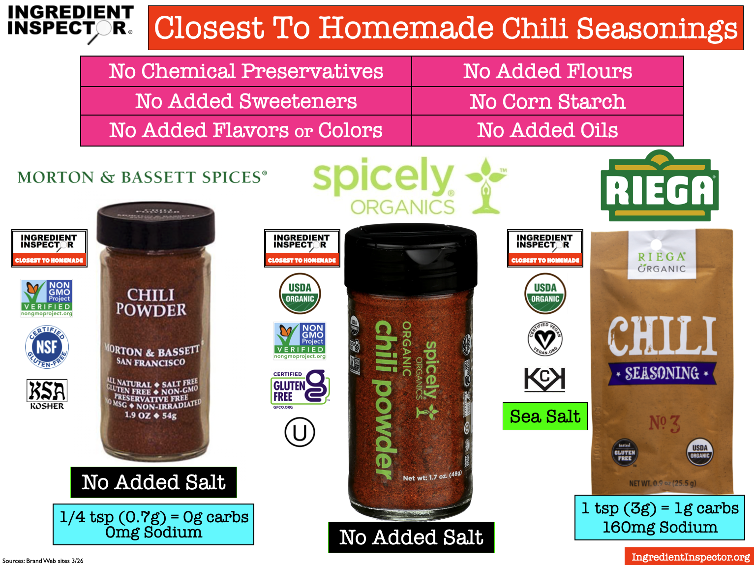 Shown below, CLOSEST TO HOMEMADE CHILI SEASONINGS: Here are some Chili Seasonings which are Closest To Homemade with no added Chemical Preservatives, Sweeteners, Flavors, Colors, Flours, Corn Starch or Oils.