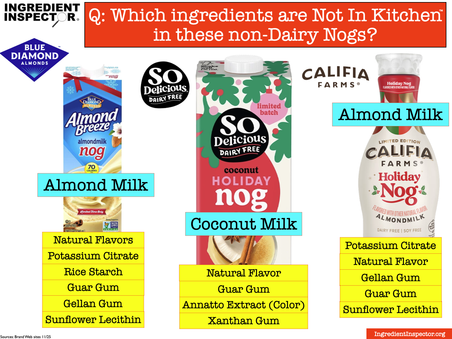 Shown below, MORE NON-DAIRY NOGS: These non-Dairy Nogs below all contain multiple ingredients Not In Kitchen: Blue Diamond Almond Breeze Nog made with Almond Milk contains six ingredients Not In Kitchen including Potassium Citrate which is a Preservative, commercial Natural Flavors, three Thickening Agents and Sunflower Lecithin as an Emulsifying Agent; So Delicious Coconutmilk Holiday Nog contains Natural Flavor, two Gums and Annatto Extract for Color; and Califia Farms Holiday Nog made with Almond Milk which has five ingredients Not In Kitchen including the Preservative Potassium Citrate, added commercial Natural Flavor, two Thickening Agents and an Emulsifier. (Sources for ingredients: Brand Web sites 11/25)