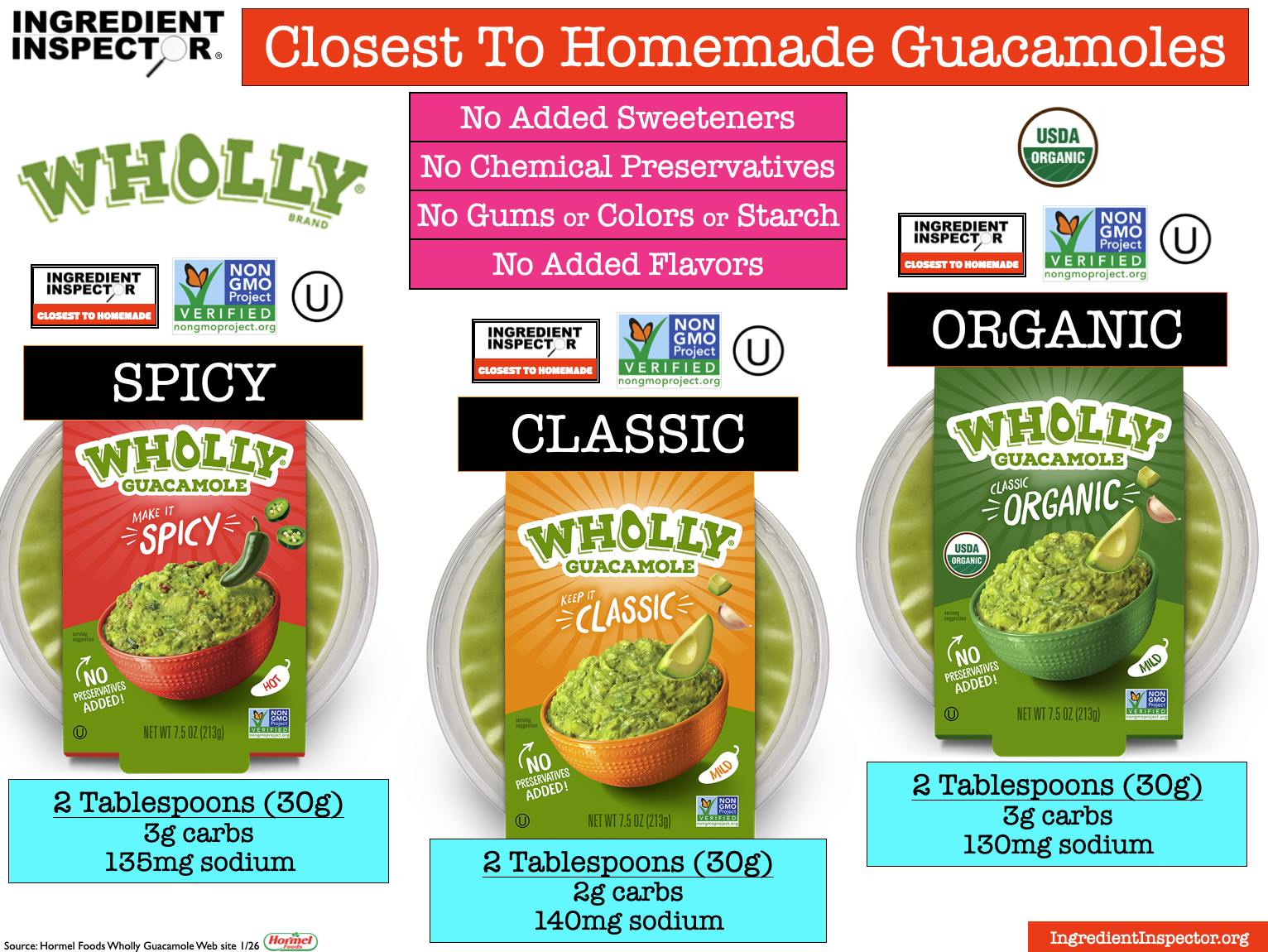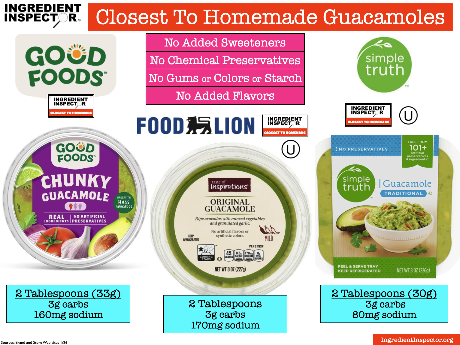 CLOSEST TO HOMEMADE: Following are several Guacamoles whose ingredients are closest to those we would use at home with no added Sweeteners, Chemical Preservatives, Gums, Color, Starch or Flavors: