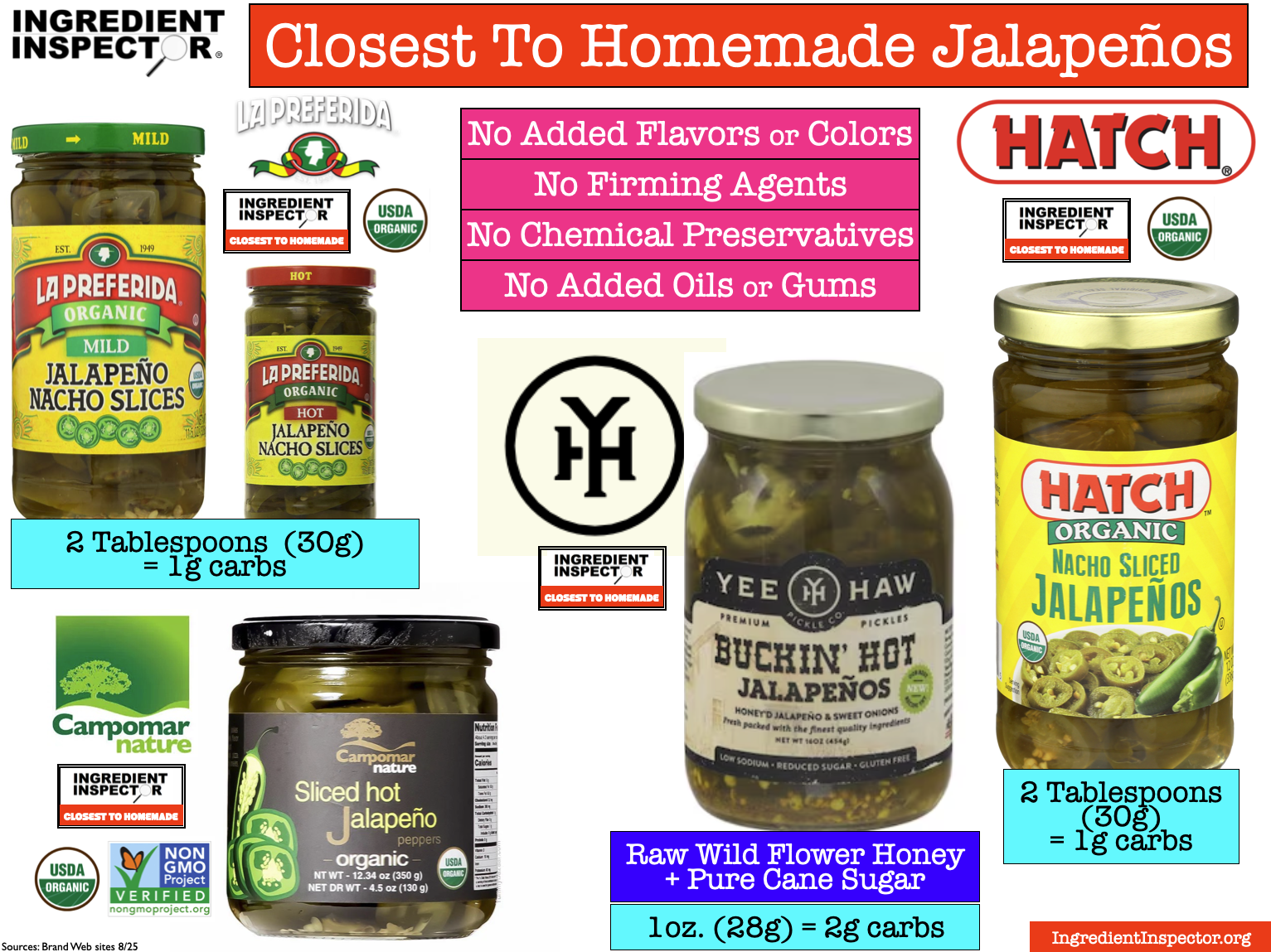 CLOSEST TO HOMEMADE JALAPENOS: Here are some delicious Jalapeños with no Added Flavors, Colors, Firming Agents, Chemical Preservatives, Oils or Gums. These include La Preferida Organic Jalapeño Nacho Slices; Organic and Non-GMO Project Verified Campomar Nature Sliced Hot Jalapeño, Yee-Haw Pickle Co. Buckin’ Hot Jalapeños sweetened with Raw Wild Flower Honey + Pure Cane Sugar, and Hatch Organic Nacho Sliced Jalapeños.