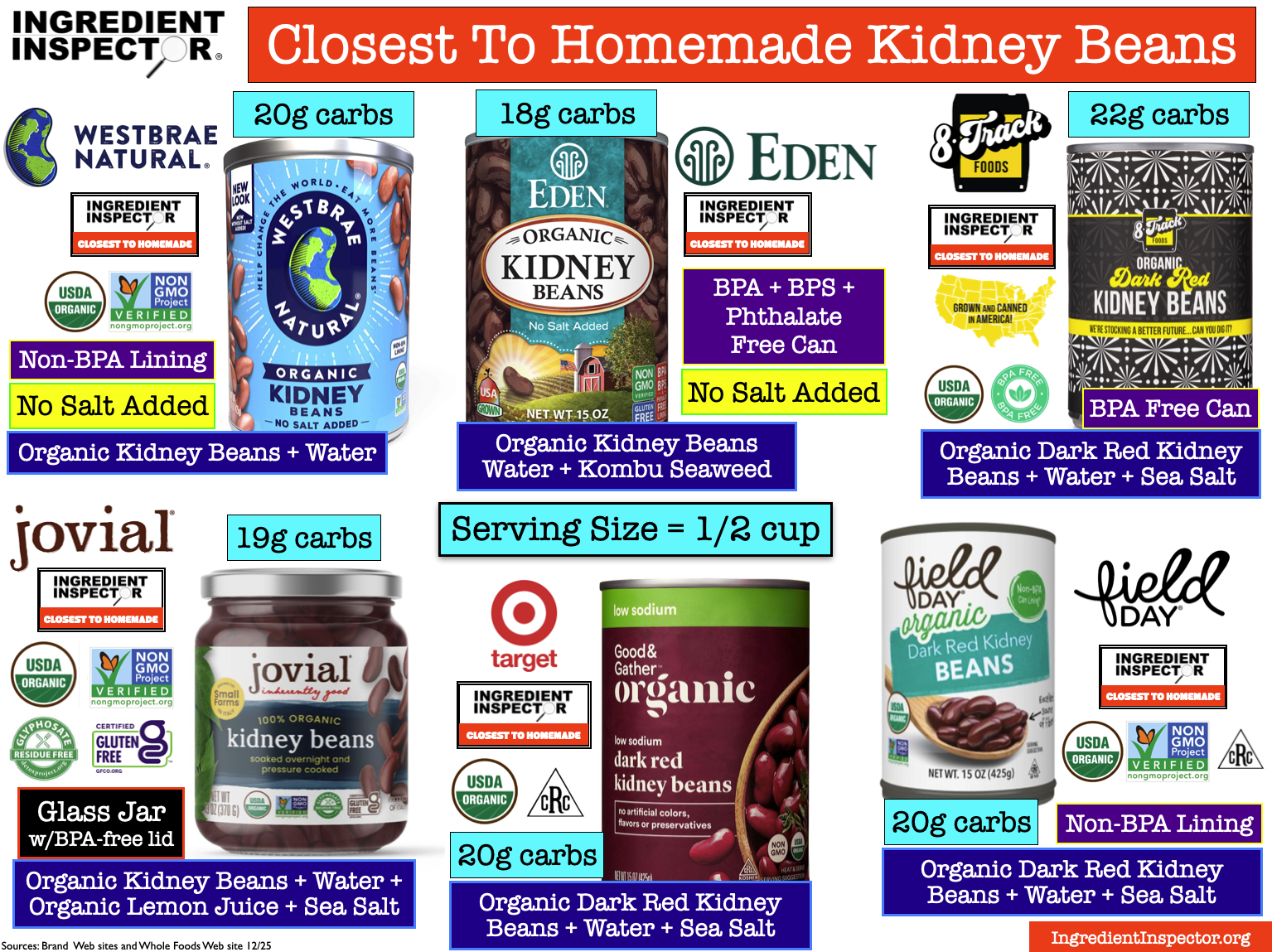 CLOSEST TO HOMEMADE BRANDS OF CANNED OR JARRED KIDNEY BEANS: These have no Chemical Preservatives, no Added Sweeteners, no Added Flavorings and use Organic Kidney Beans. The Closest To Homemade brands include USDA Organic + Non-GMO Project Verified Westbrae Natural with Non-BPA can lining; Eden Foods with Organic Kidney Beans with a BPA + BPS + Phthalate Free Can; USDA Organic 8 Track Foods with Non-BPA lining; USDA Organic in a glass jar with BPA-free lid Jovial from Italy which is also Certified Gluten-Free and Glyphosate Free; Target’s Good & Gather Organic, and USDA Organic + Non-GMO Project Verified Field Day with a Non-BPA can lining. (Sources: Brand Web sites 12/25)