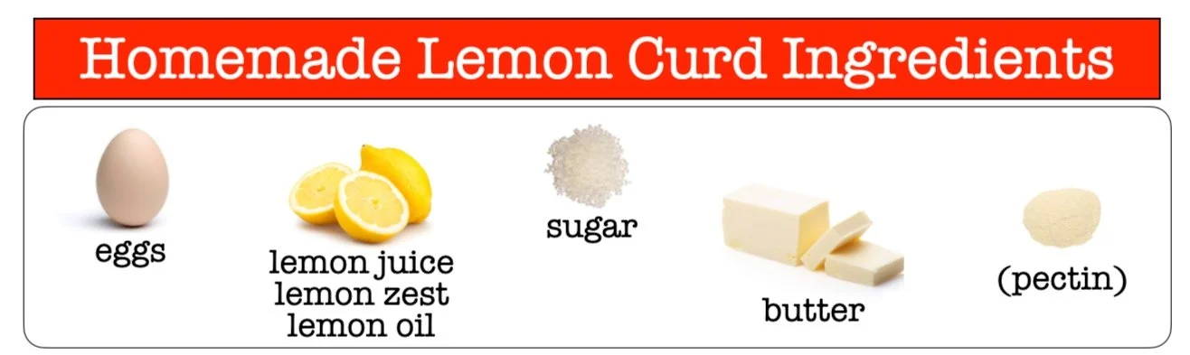 Homemade Lemon Curd is just a few simple ingredients >> Eggs, Lemon Juice and/or Lemon Zest and/or Lemon Oil, Sugar, Butter and possibly Pectin. Yum!