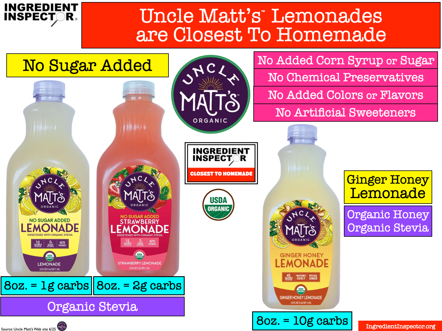 Uncle Matt’s Lemonades are sweetened with Organic Stevia and/or Organic Honey and are Closest To Homemade: