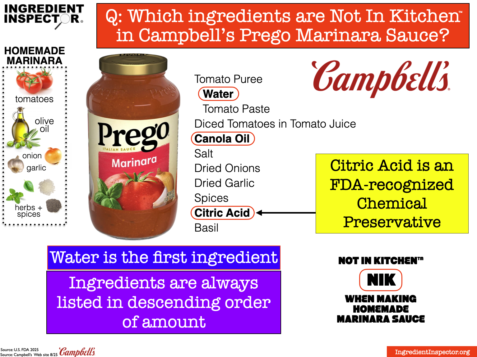 CAMPBELL'S PREGO MARINARA SAUCE CONTAINS THREE INGREDIENTS NOT IN KITCHEN: Water, Canola Oil and the FDA-recognized Chemical Preservative - Citric Acid - would not be in our kitchens if we were making homemade Marinara Sauce. According to the FDA 2025, 95% of U.S. Canola is from GMO seed.