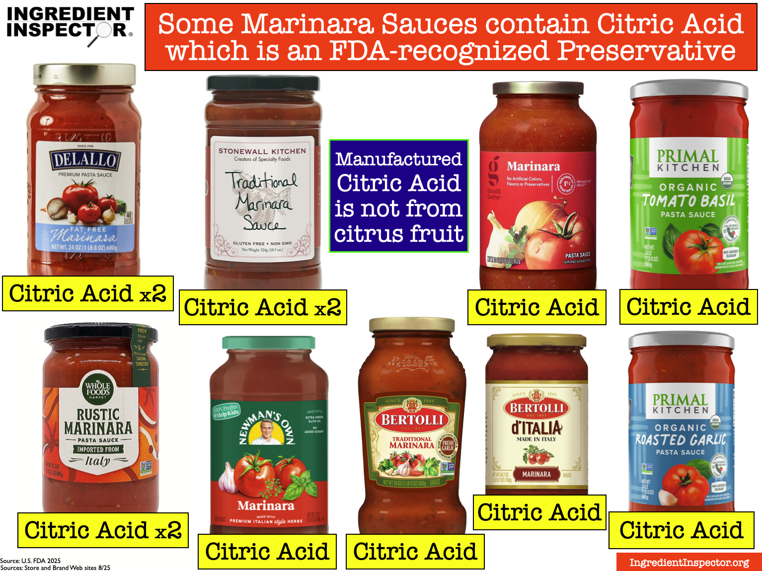 MANUFACTURED CITRIC ACID: In addition to Ragú and Prego Marinara Sauces, many other Marinara Sauces contain Citric Acid: