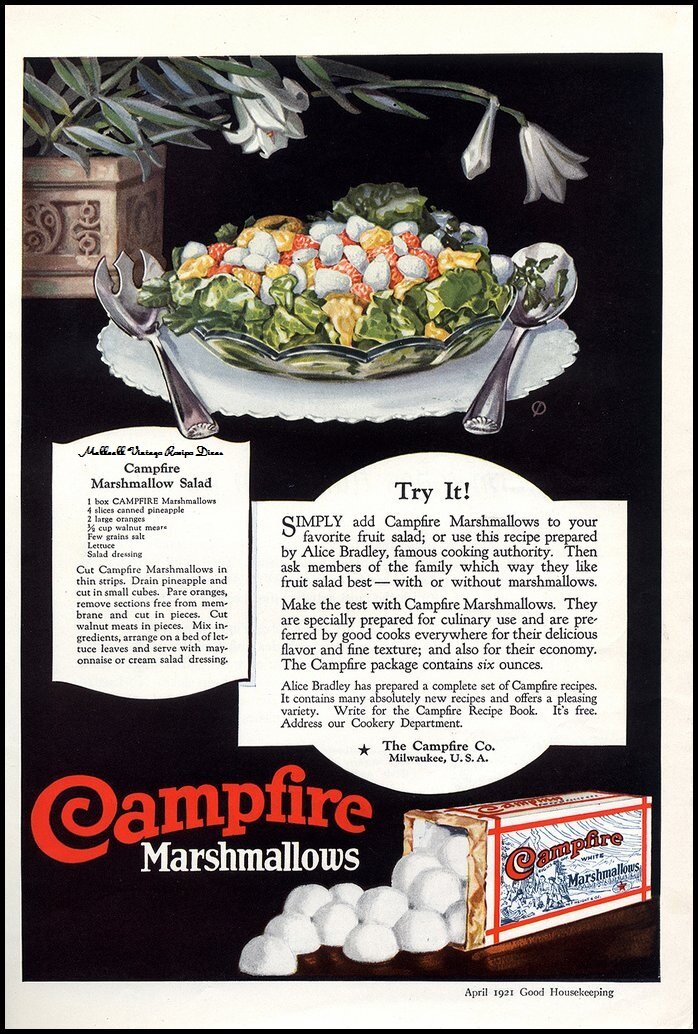 MARSHMALLOWS HAVE BEEN PART OF HOLIDAY RECIPES FOR DECADES. We see here advertisements for Holiday recipes which include marshmallows: