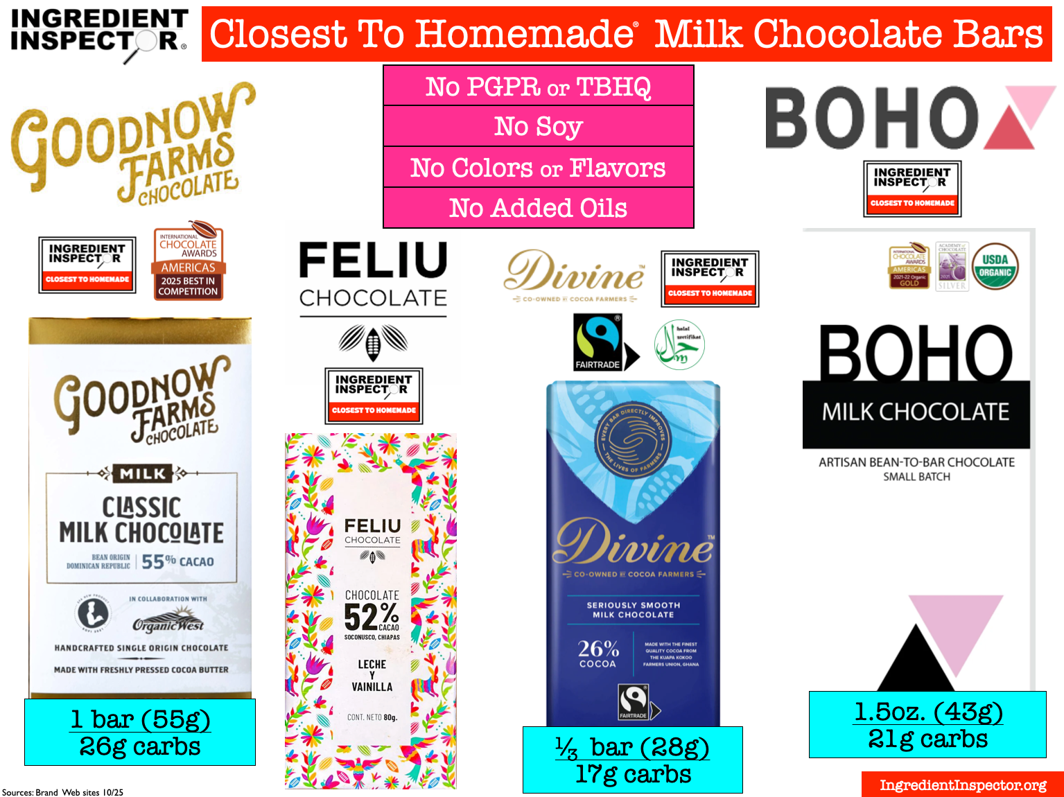 CLOSEST TO HOMEMADE: Following are several Milk Chocolate Bars which are Closest To Homemade with no PGPR, TBHQ, Soy, Colors, Flavors or Oils.
