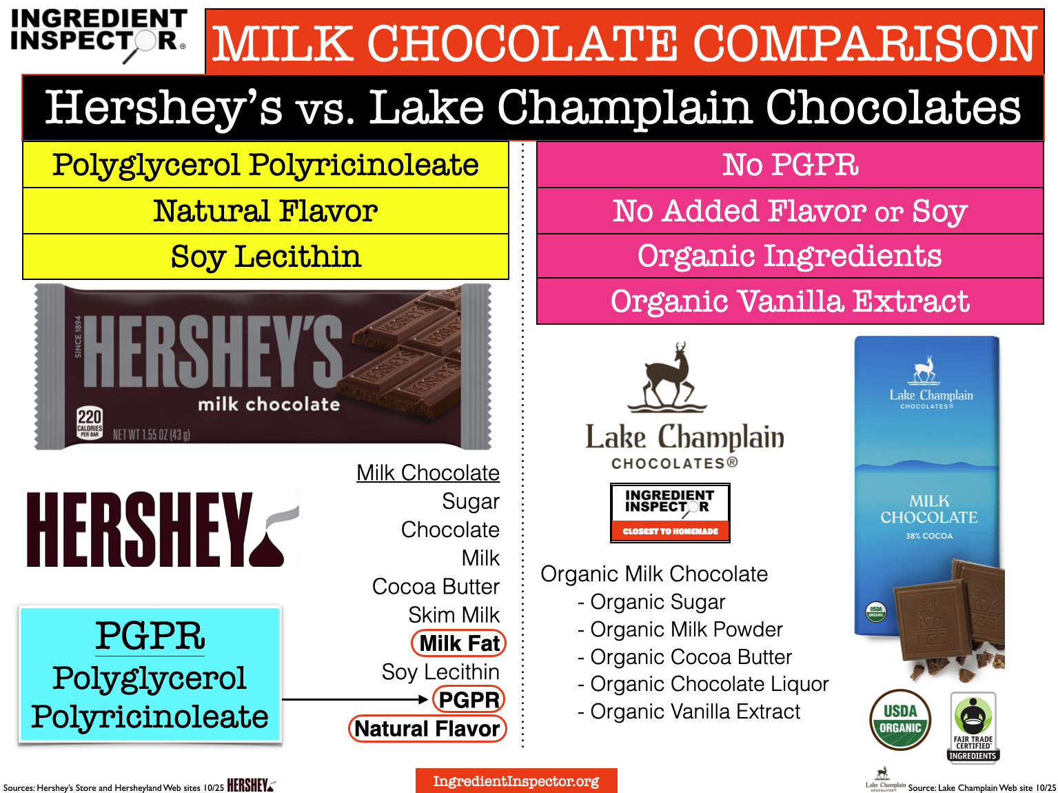 Below is a comparison of Hershey’s to a Closest To Homemade Milk Chocolate Bar from Lake Champlain Chocolates.