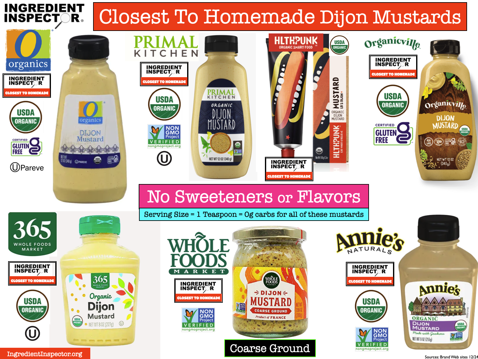 CLOSEST TO HOMEMADE DIJON MUSTARDS: Seen below are some Closest To Homemade Dijon Mustards including O Organics, Primal Kitchen, Hlthpunk, Organicville, Whole Foods 365, Whole Foods and Annie’s.