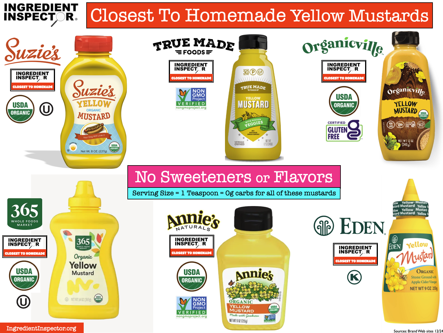 CLOSEST TO HOMEMADE YELLOW MUSTARDS: There are a few Yellow Mustard brands which have no added sweeteners and no added flavors and are Closest To Homemade >> these include Suzie’s Organic + Non-GMO Project Verified Yellow Mustard; True Made Foods Yellow Mustard; Original Yellow Mustard; Organicville Organic Yellow Mustard; Whole Foods 365 Organic Yellow Mustard; Annie’s Organic + Non-GMO Project Verified Yellow Mustard, and Eden Organic Yellow Mustard made with Apple Cider Vinegar. (Sources for ingredients: Brand Web sites 12/24)