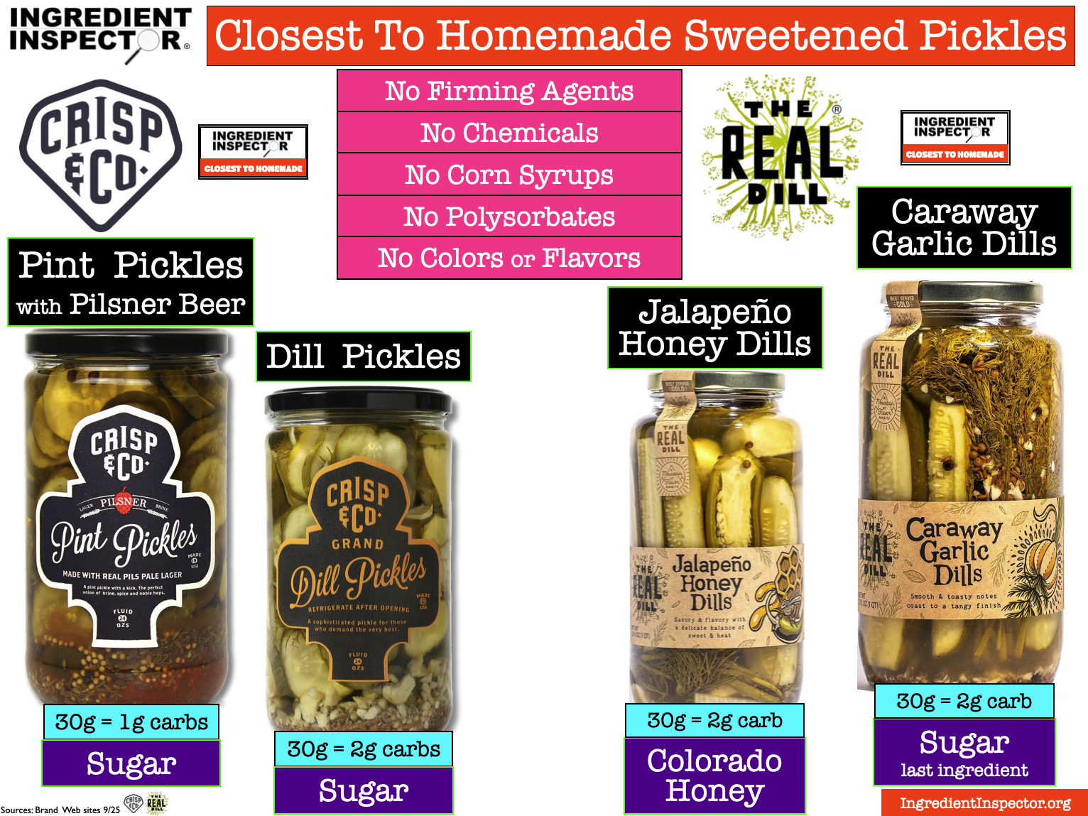CLOSEST TO HOMEMADE SWEETENED PICKLES: Seen below, these Pickles have no added Firming Agents, Chemicals, Corn Syrups, Polysorbates, Colors or Flavors. (Sources: Brand Web sites 9/25).