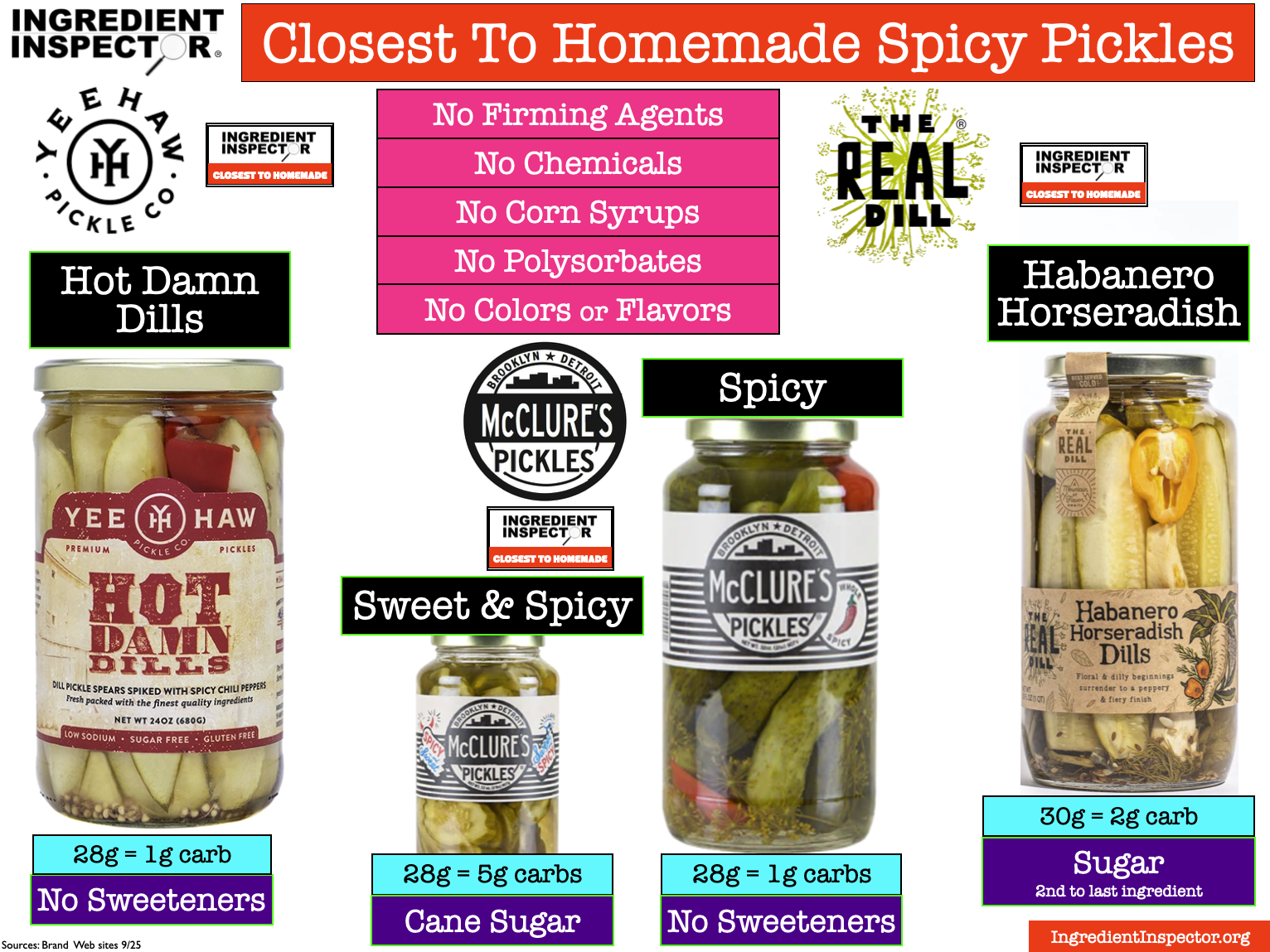 CLOSEST TO HOMEMADE SPICY PICKLES: Seen below, these Pickles have no added Firming Agents, Chemicals, Corn Syrups, Polysorbates, Colors or Flavors. (Sources: Brand Web sites 9/25).