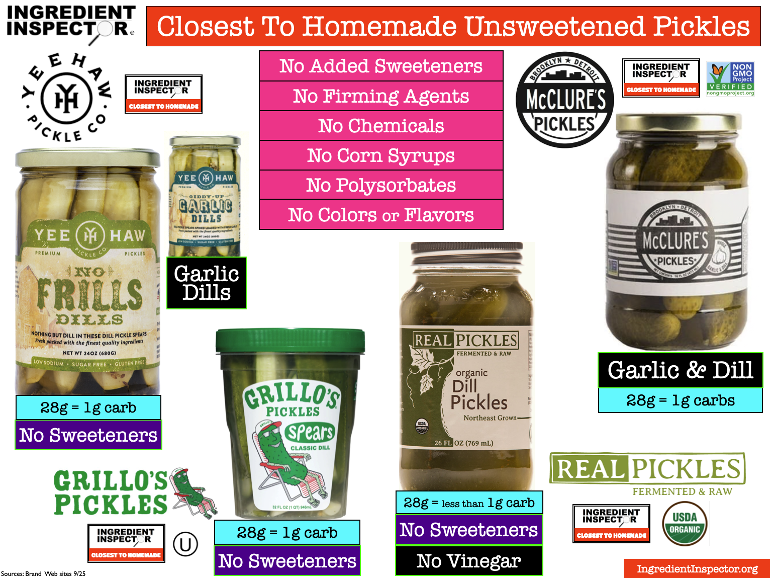 CLOSEST TO HOMEMADE UNSWEETENED DILL PICKLES: Seen below, these Pickles have no added Sweeteners, Firming Agents, Chemicals, Corn Syrups, Polysorbates, Colors or Flavors. (Sources: Brand Web sites 9/25).
