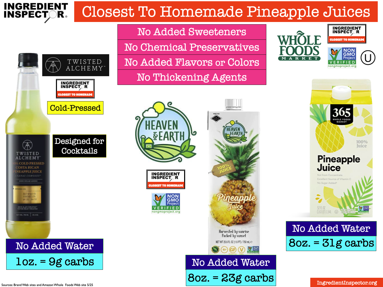 Shown below, Twisted Alchemy designed for cocktails is Cold-Pressed with no added Water in a slim glass bottle, Heaven & Earth in aseptic packaging is Non-GMO Project verified with no added Water, and Whole Foods 365 Pineapple Juice with no added Water. (Sources: Brand Web sites 5/25)