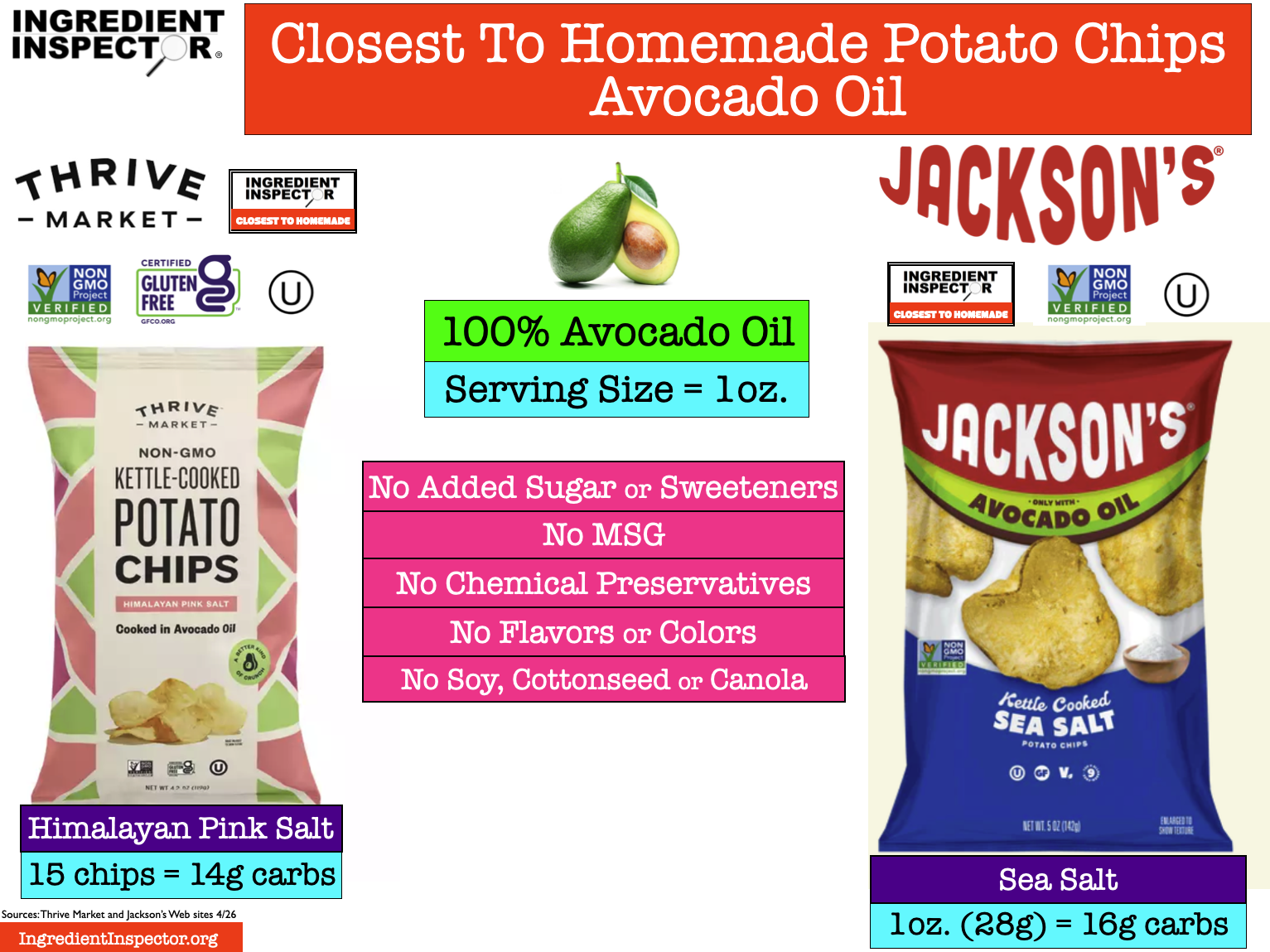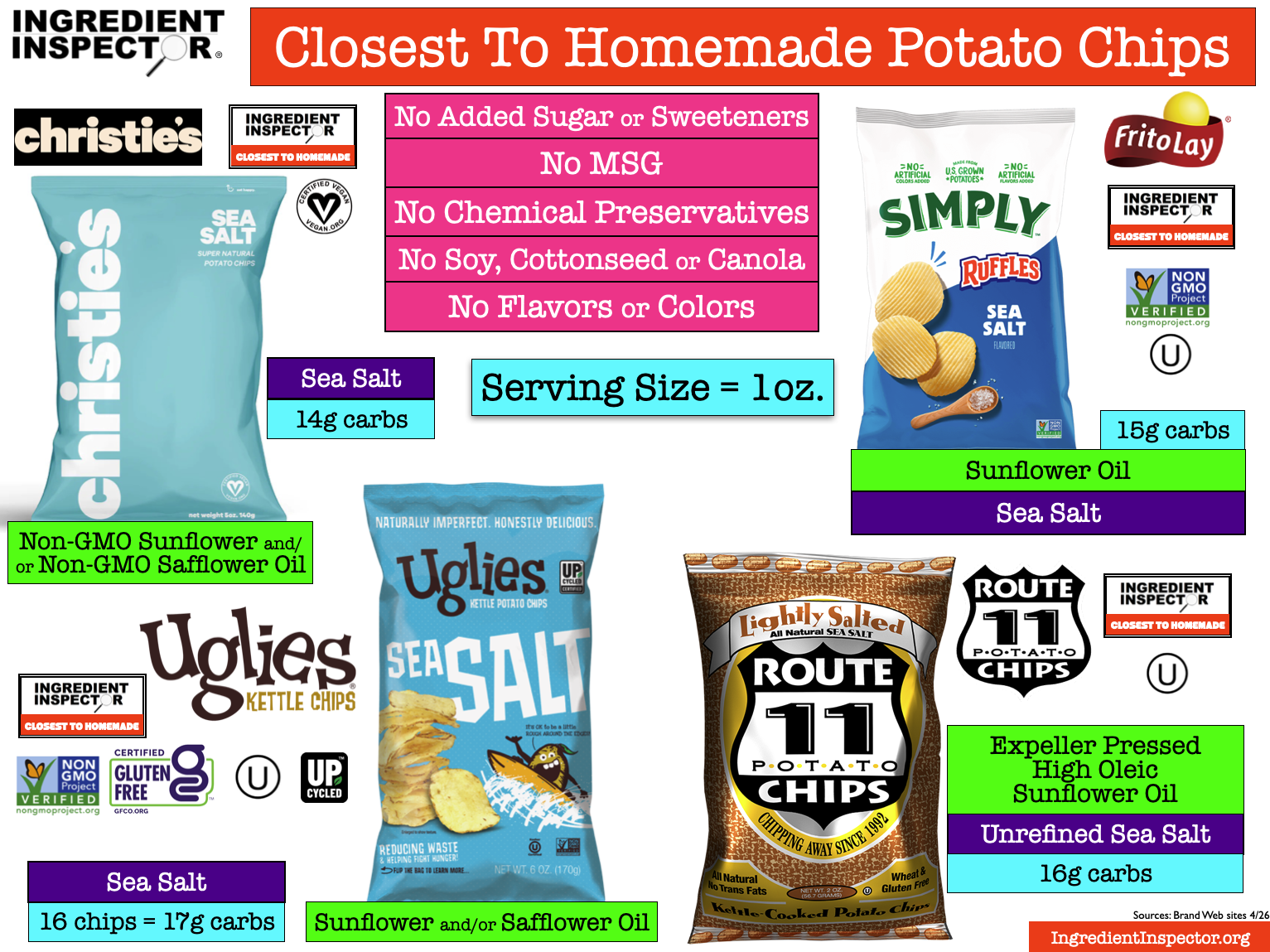 Closest To Homemade POTATO CHIPS: Here are some Plain Potato Chips with Sea Salt or Pink Himalayan Salt which are Closest To Homemade with no added Sugar or Sweeteners, MSG, Chemical Preservatives, Soybean Oil, Cottonseed Oil, Canola Oil, Corn Oil, Flavors or Colors. (Sources: Brand Web sites 4/26)