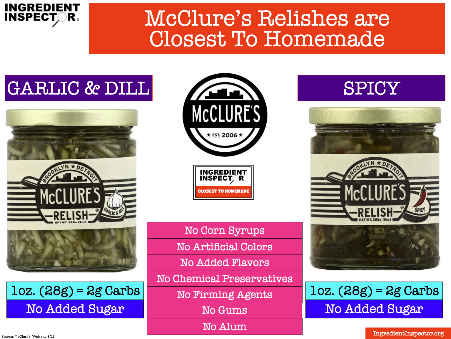 CLOSEST TO HOMEMADE: We discovered Relishes from McClure’s which are Closest To Homemade with no Corn Syrups, Artificial Colors, Added Flavors, Chemical Preservatives, Firming Agents, Gums or Alum. McClure’s Garlic & Dill Relish and McClure’s Spicy Relish.