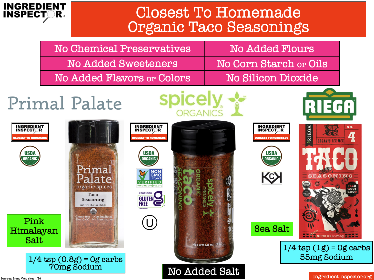 THE GOOD NEWS >> Shown below, there are several brands of Taco Seasonings which are Closest To Homemade with no added Chemical Preservatives, Sugar, Flavors, Colors, Flours, Corn Starch or Oils. These include Primal Palate Organic Taco Seasoning with Pink Himalayan Salt; Non-GMO Project verified Spicely Organics Organic Taco Seasoning with no Added Salt which is certified Gluten Free and Kosher; Riega Organic Taco Seasoning with Sea Salt which is certified Kosher; Non-GMO Project verified Fody Low FODMAP Taco Seasoning with no Onions or Garlic which is certified Kosher + Gluten-Free; Flavorgod Taco Tuesday Seasoning with Sea Salt, and a Closest To Homemade offering from Clean Monday Meals. (Sources: Brand Web sites 1/26)