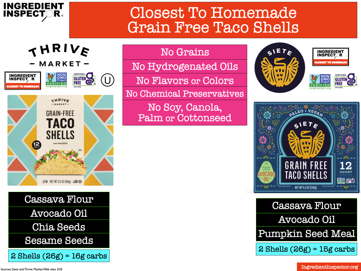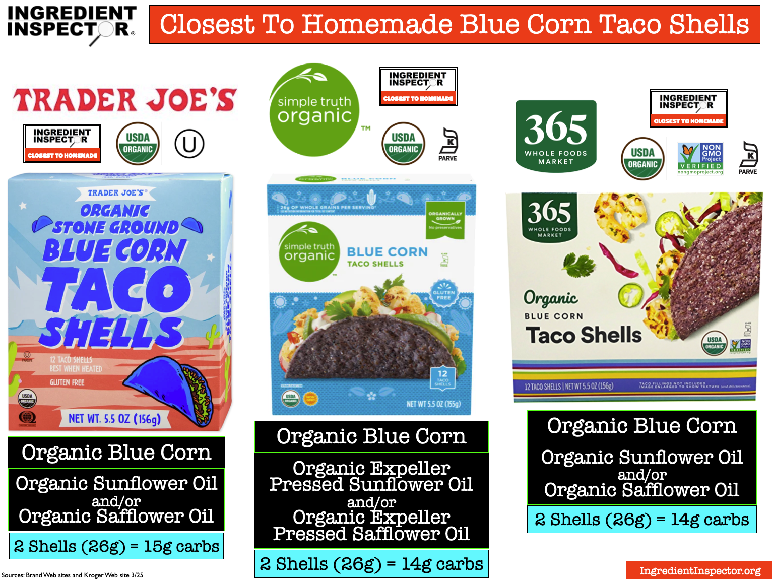 CLOSEST TO HOMEMADE: Following are some Taco Shells which are Closest To Homemade with no Hydrogenated Oils, no Soy, Canola, Palm or Cottonseed Oils and no added Flavors, Colors or Chemical Preservatives. Some are made from Organic Blue Corn while others are made with Organic Yellow Corn plus there are a couple of Grain Free + Gluten Free options made with Cassava Flour.
