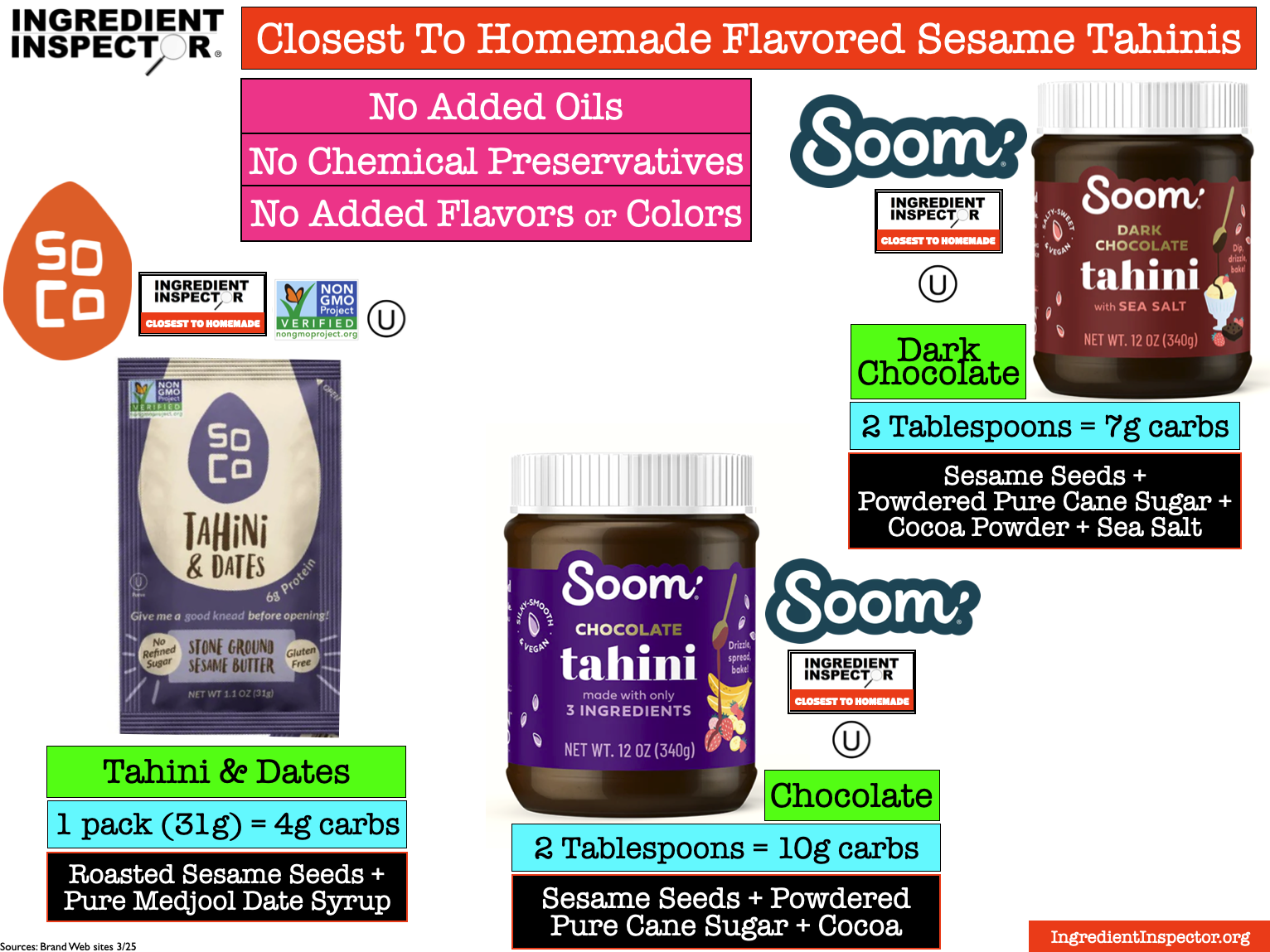 ROASTED FLAVORED WHITE SESAME TAHINIS: These include Non-GMO Project verified SoCo Tahini & Dates made with Roasted Sesame Seeds + Pure Medjool Date Syrup; Soom Dark Chocolate and Chocolate Tahinis made with Powdered Pure Cane Sugar + Cocoa Powder. (Sources: Brand Web sites 3/25)