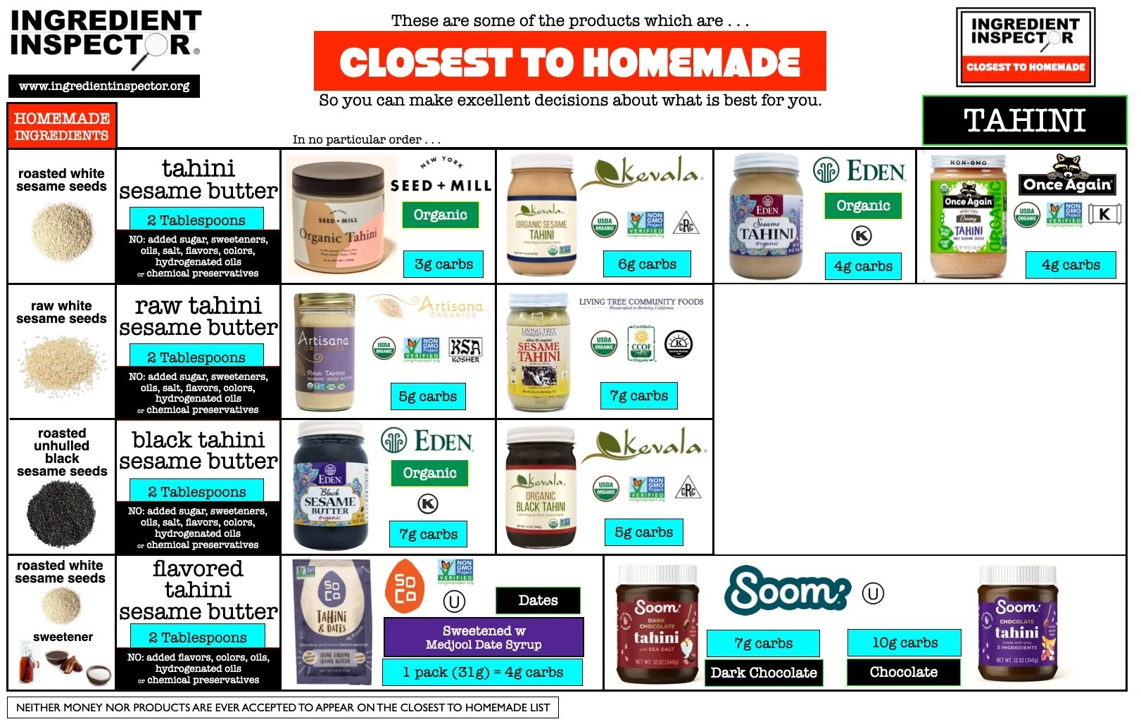 Shown below, there are several Plain Tahinis which are Closest To Homemade with no Added Sweeteners, Salt, Oils, Chemical Preservatives., Flavors or Colors.