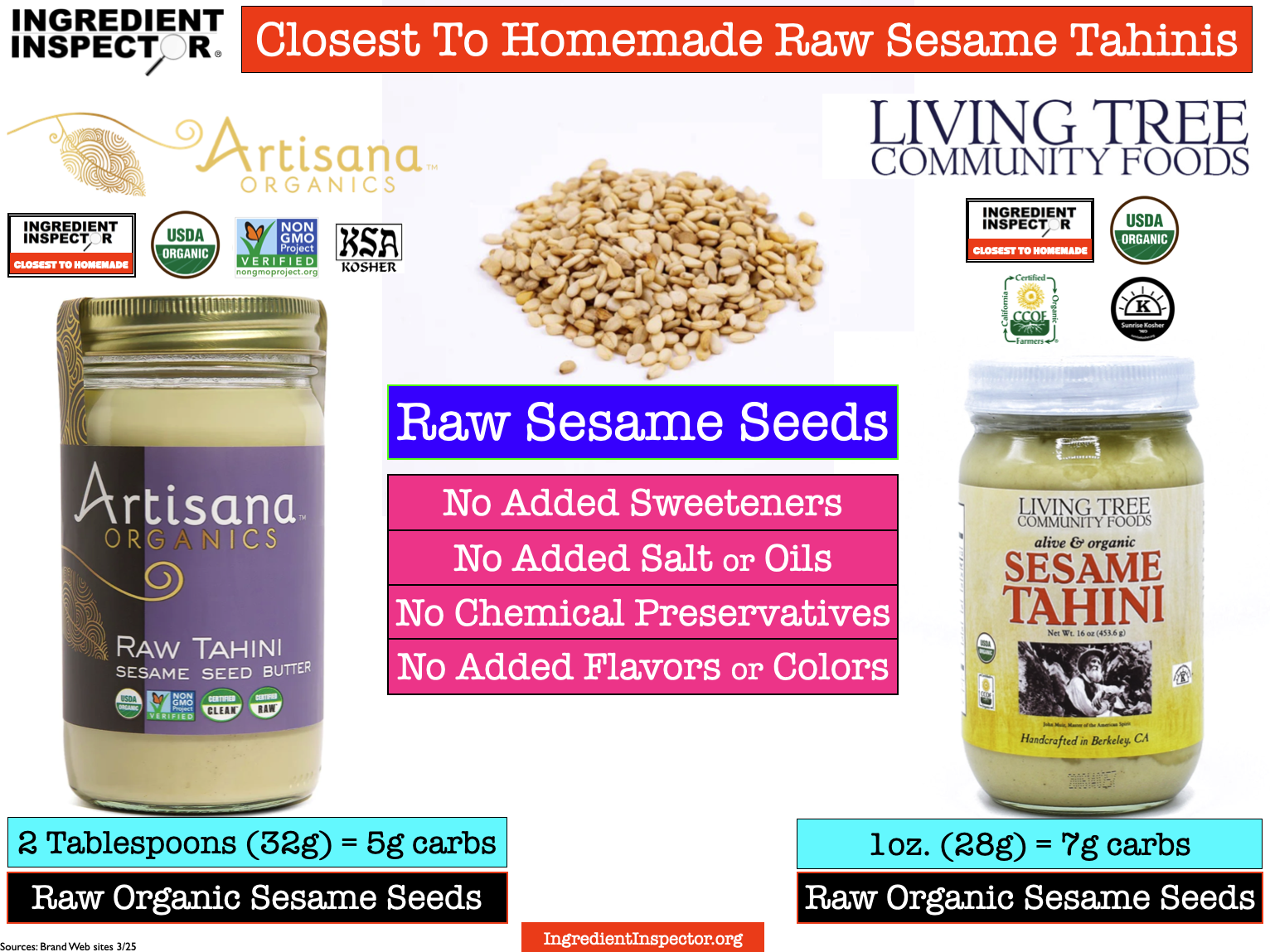 Seen below, RAW WHITE SESAME TAHINIS: These include Non-GMO Project verified Artisana Organics made with Raw Organic White Sesame Seeds; Living Tree Community Foods Alive & Organic Sesame Tahini made with Raw Organic White Sesame Seeds. (Sources: Brand Web sites 3/25)