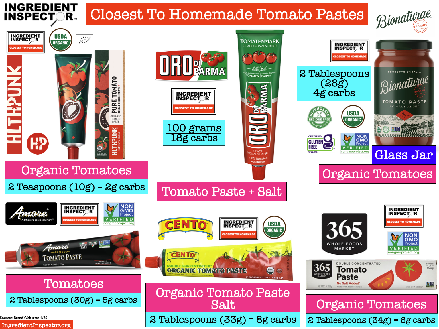 CLOSEST TO HOMEMADE TOMATO PASTES: Here are a few Tomato Pastes which are Closest To Homemade with no added Preservatives, Sugar, Water or Oils. These include USDA Certified Organic Hlthpunk (they make several Closest To Homemade pastes/sauces), Oro di Parma, USDA Certified Organic and Certified Gluten-Free Bionaturae in a glass jar which is also Non-GMO Project Verifie and certified Glyphosate Residue Free, Amoré with only Non-GMO Project Certified Tomatoes, USDA Certified Organic Cento in a tube and Whole Foods 365 (Sources: Brand Web sites 4/26)